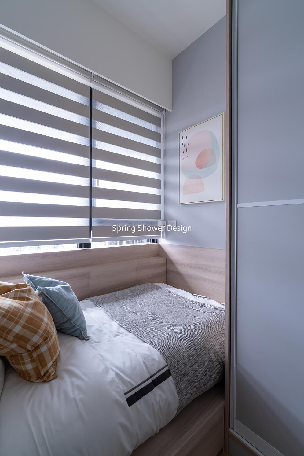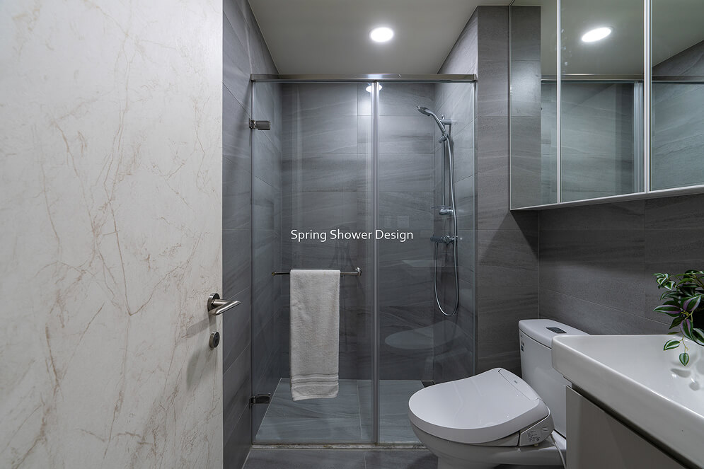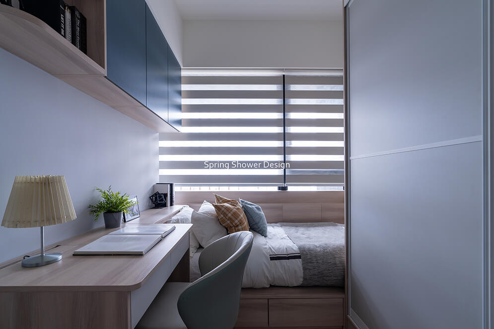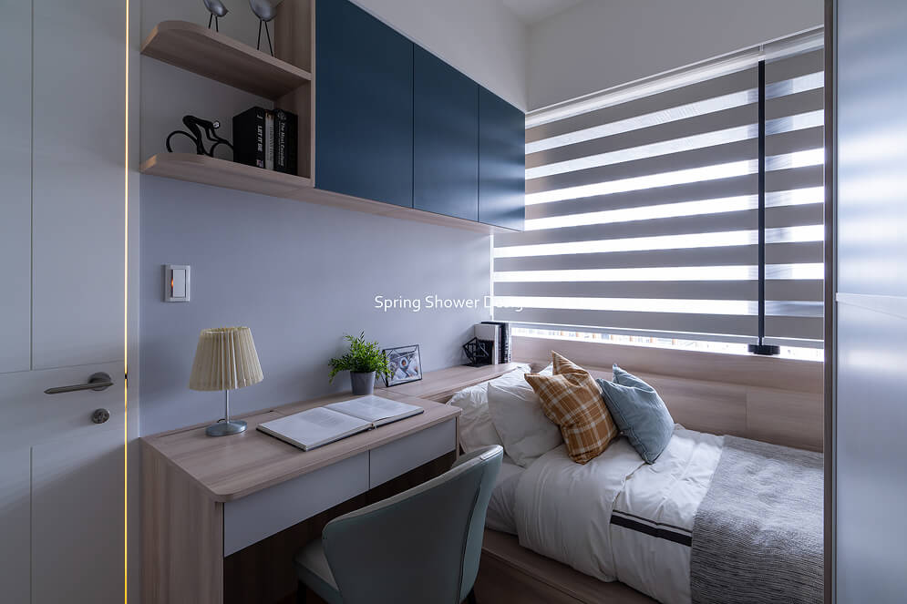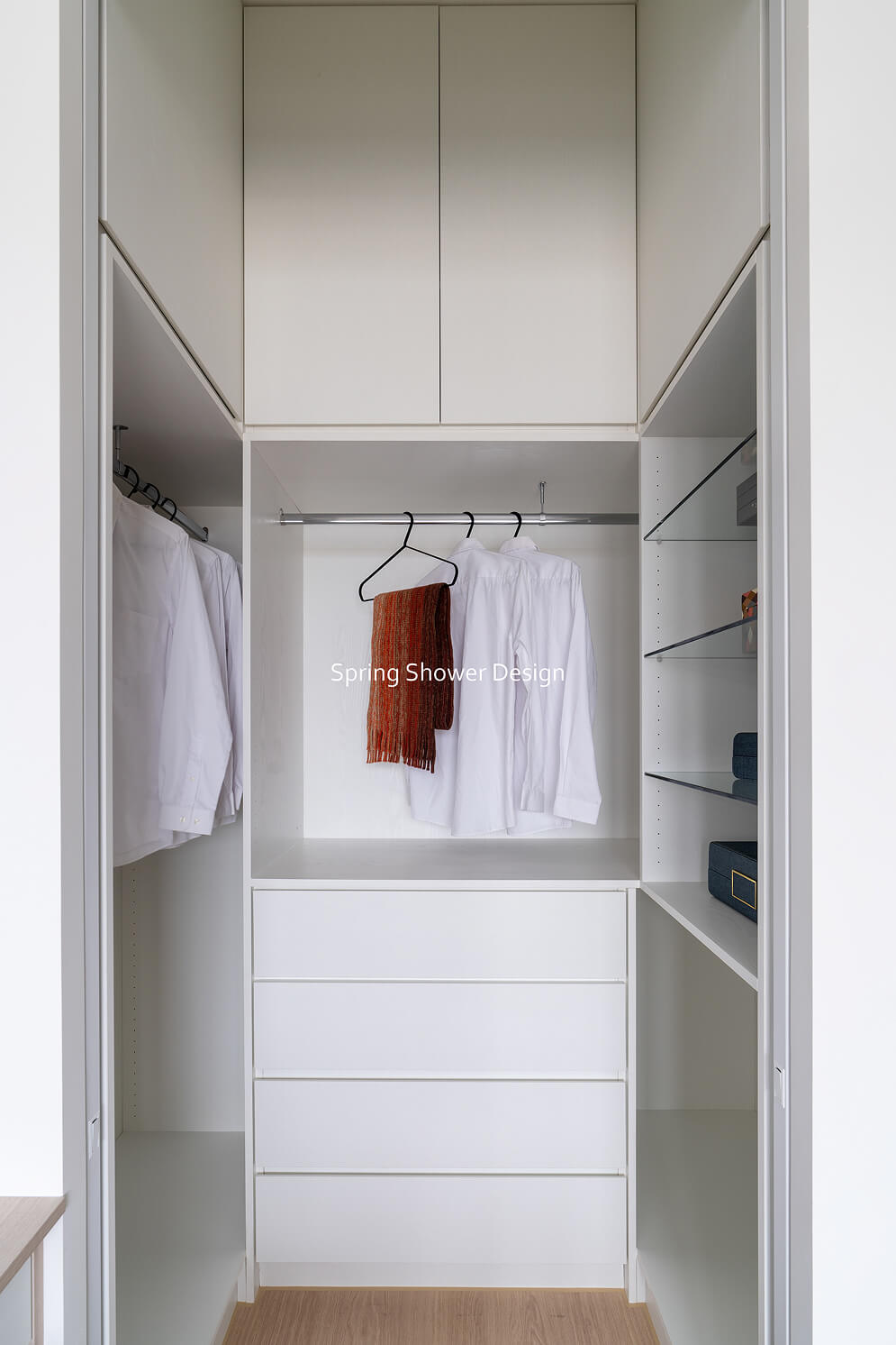 主臥採藏青色布織紋板材,連接化妝桌上櫃做到頂;步入式更衣室採ㄇ字型收納,床尾保留充足走道,手刷塗料牆延伸至主浴室暗門位置。主浴退掉浴缸,以淋浴為主,乾濕區縮放,多出的空間用於走廊高櫃收納。