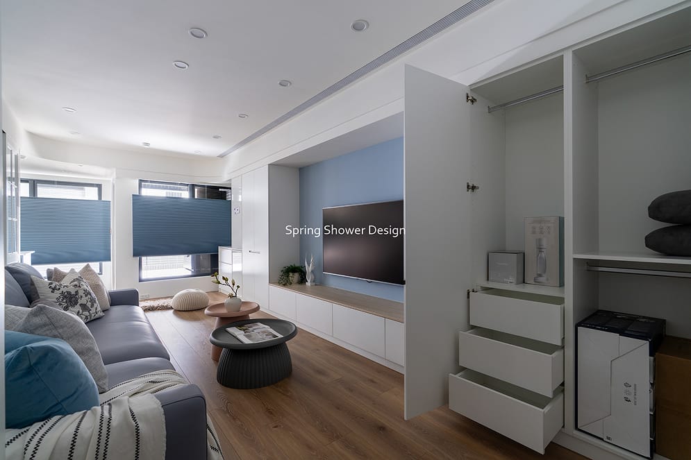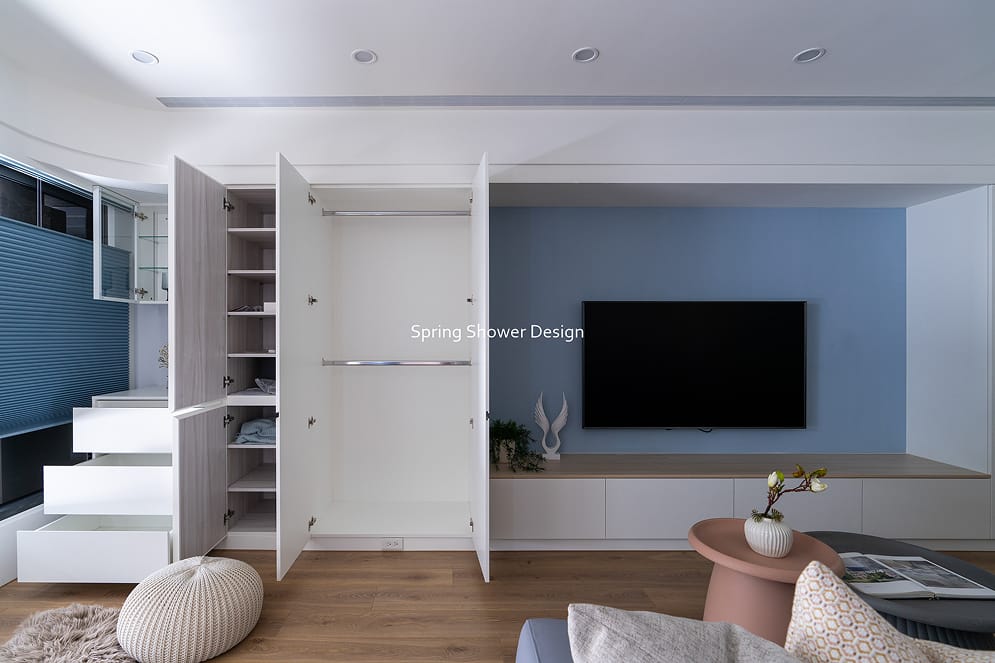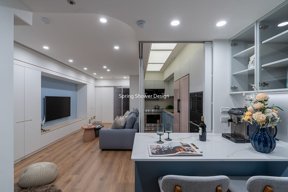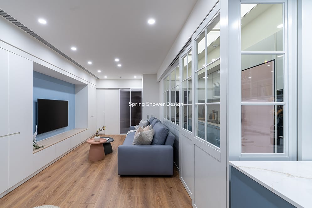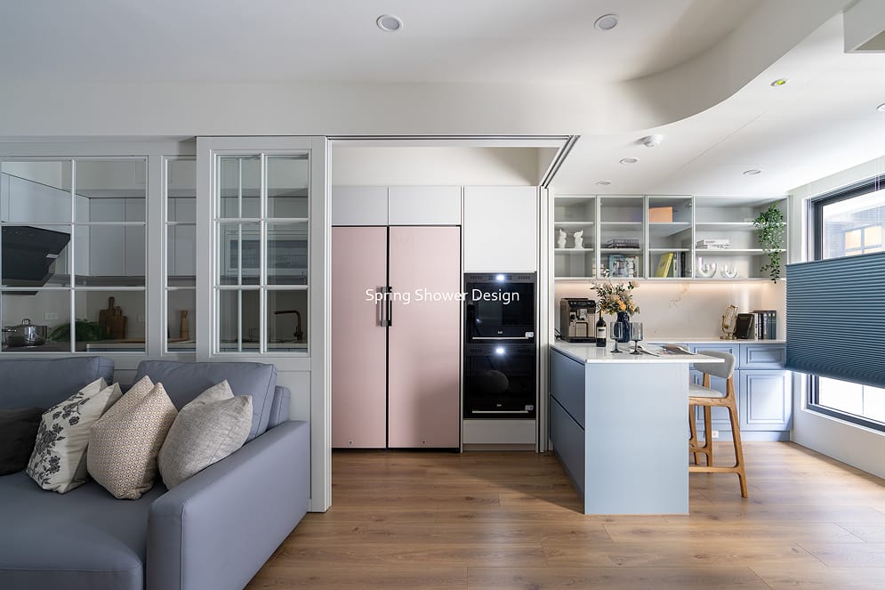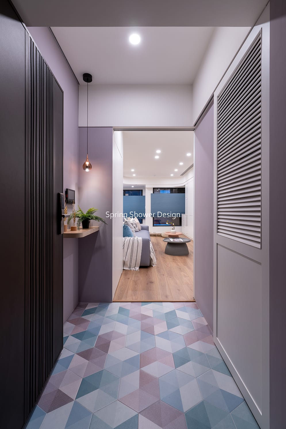 我們將公共空間機能整合為大玄關、大客廳與大廚房,並結合工作與用餐區,讓有限坪數發揮最大坪效;以水洗藍與白色為主軸,搭配超耐磨木地板,讓毛孩自在活動。玄關以屋主喜愛的「丁香紫」為主調,搭配輕美式造型門,規劃「二進式玄關」,區隔大門動線、避免寵物外衝,同時結合落塵區設計,方便毛孩散步回家後清潔腳掌。地坪鋪設丁香紫與水洗藍的彩色六角磚,為空間增添個性層次。玄關後方「隱藏步入式衣帽間」,整合鞋櫃、包包與行李箱收納,並加裝奈米水離子發生器,兼顧空氣品質與寵物健康。