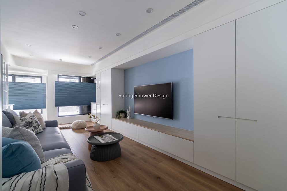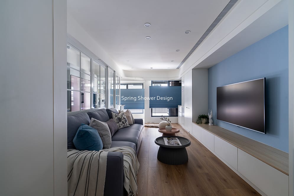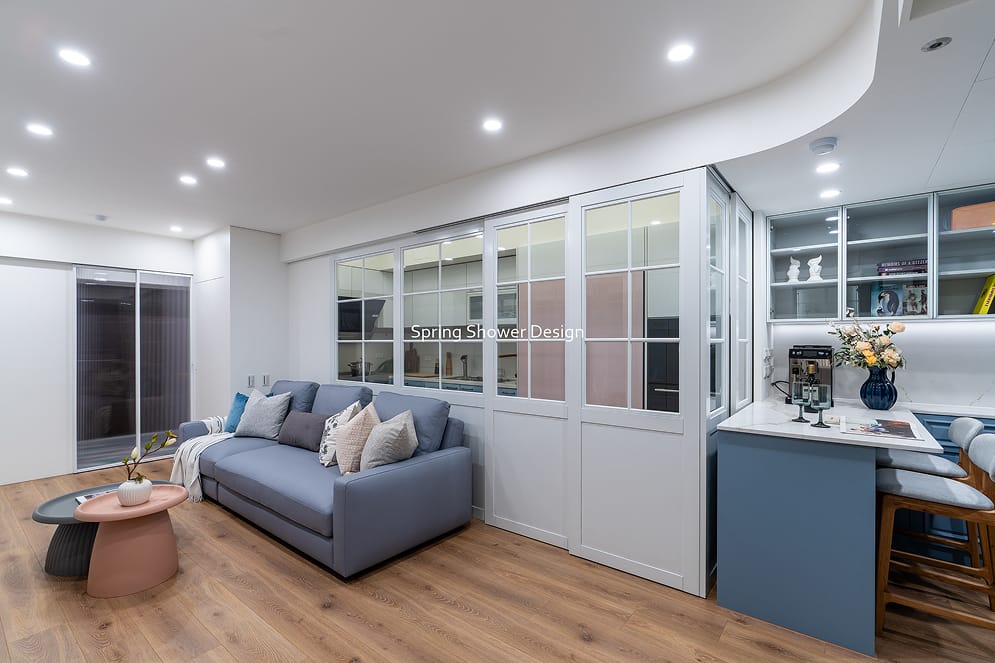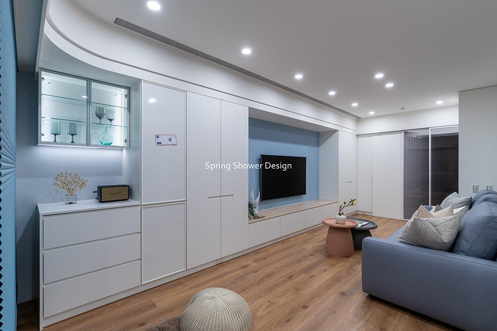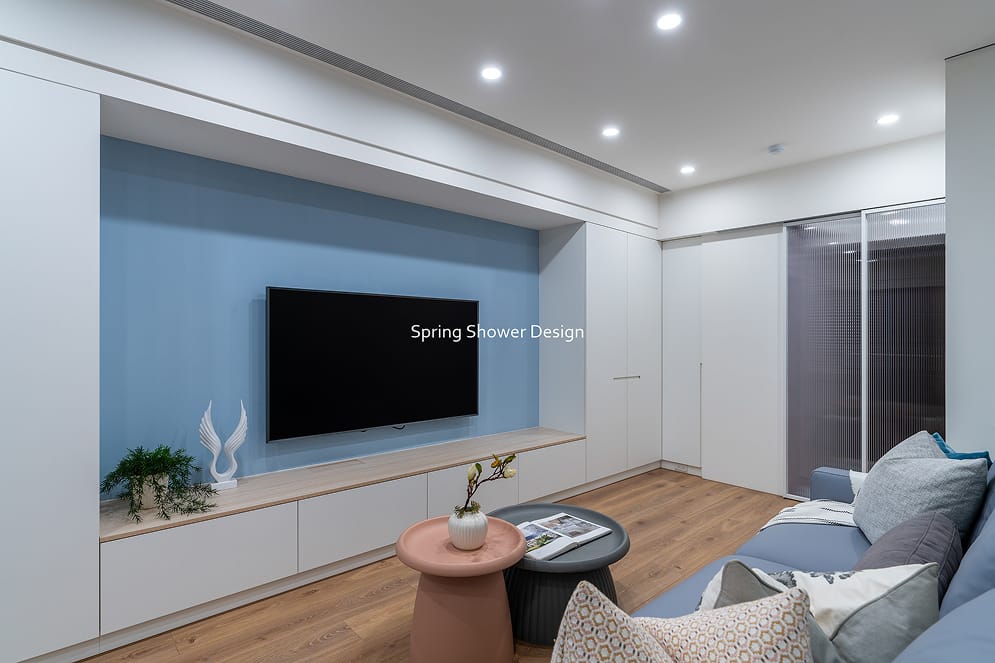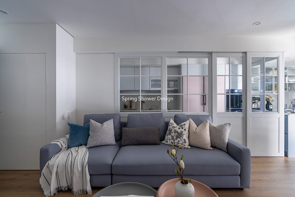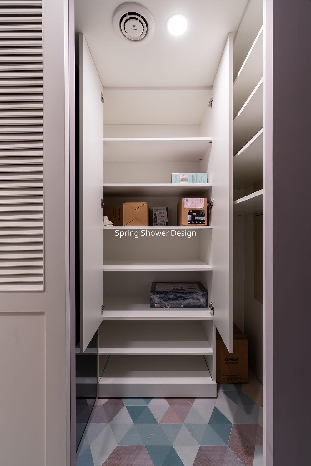 我們將公共空間機能整合為大玄關、大客廳與大廚房,並結合工作與用餐區,讓有限坪數發揮最大坪效;以水洗藍與白色為主軸,搭配超耐磨木地板,讓毛孩自在活動。玄關以屋主喜愛的「丁香紫」為主調,搭配輕美式造型門,規劃「二進式玄關」,區隔大門動線、避免寵物外衝,同時結合落塵區設計,方便毛孩散步回家後清潔腳掌。地坪鋪設丁香紫與水洗藍的彩色六角磚,為空間增添個性層次。玄關後方「隱藏步入式衣帽間」,整合鞋櫃、包包與行李箱收納,並加裝奈米水離子發生器,兼顧空氣品質與寵物健康。