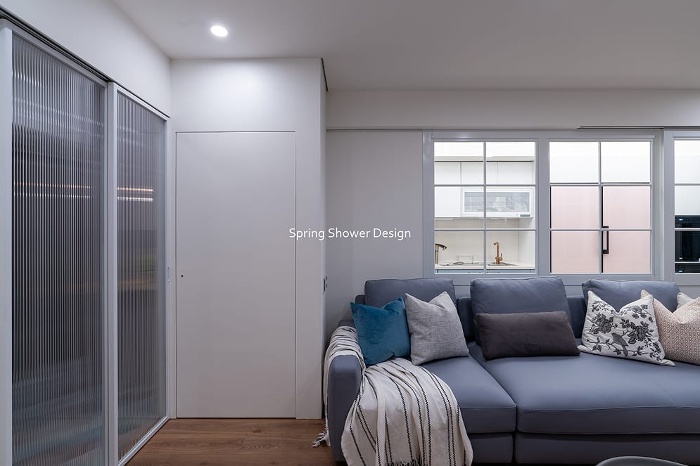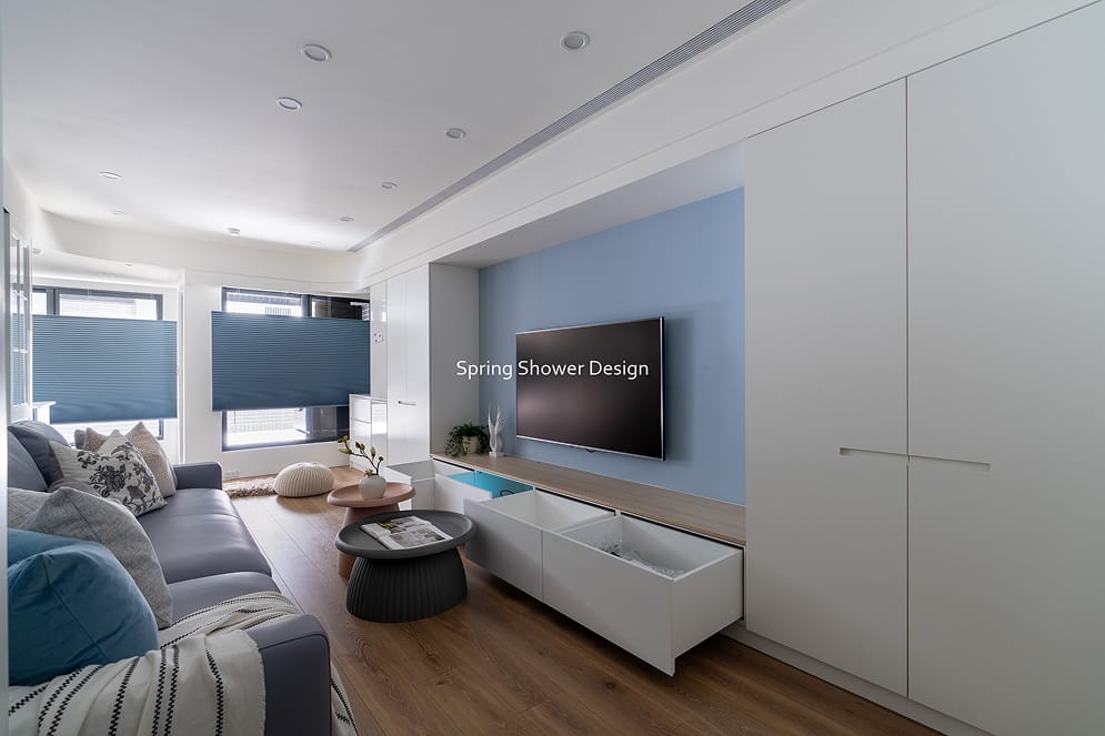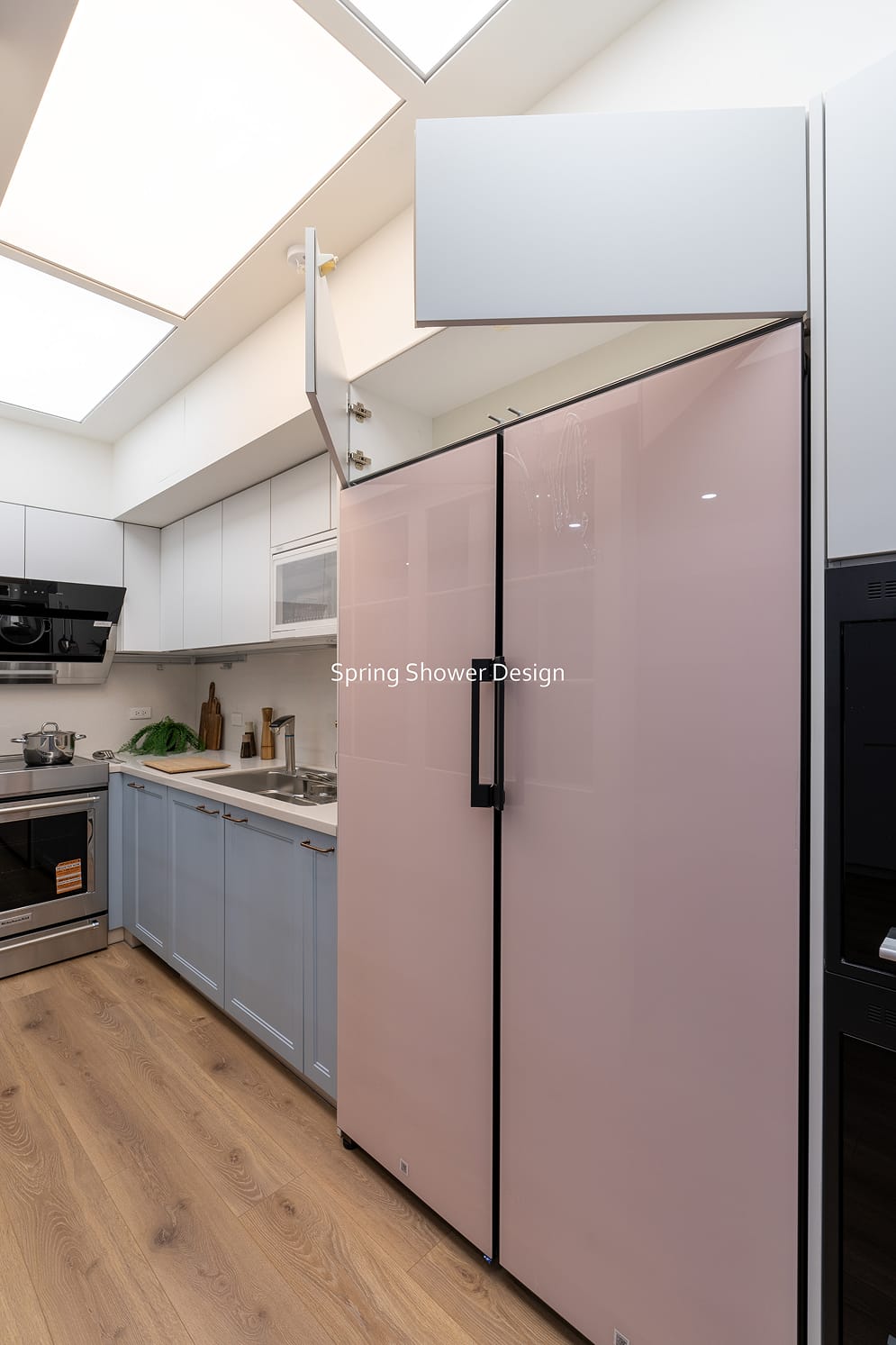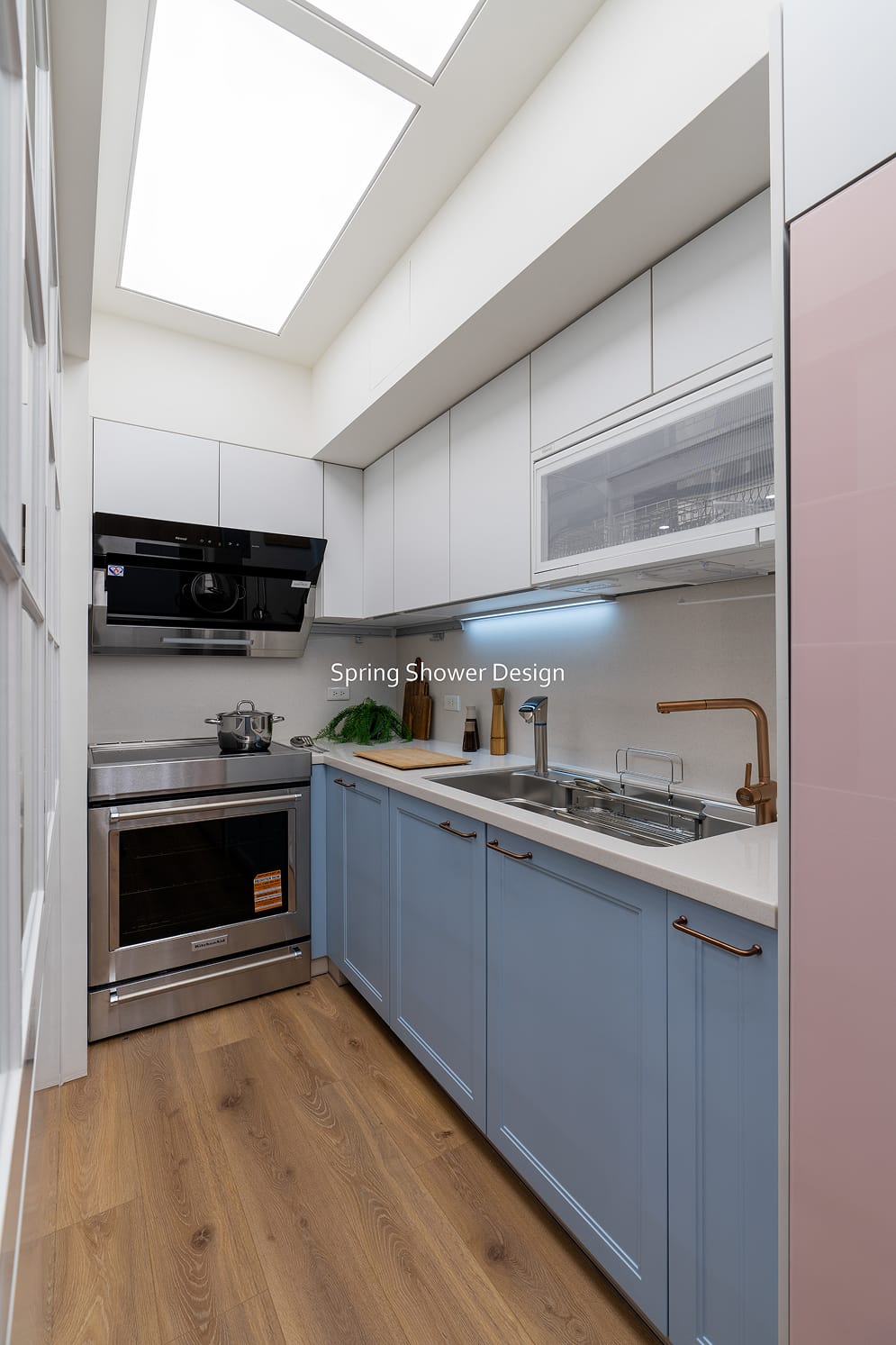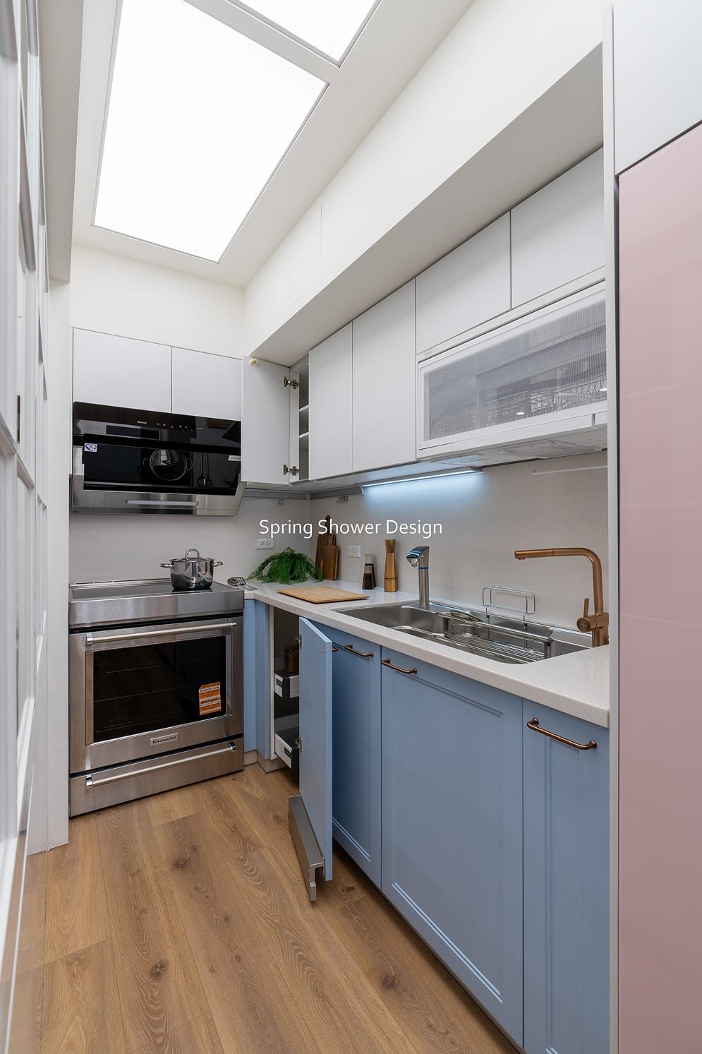 我們將公共空間機能整合為大玄關、大客廳與大廚房,並結合工作與用餐區,讓有限坪數發揮最大坪效;以水洗藍與白色為主軸,搭配超耐磨木地板,讓毛孩自在活動。玄關以屋主喜愛的「丁香紫」為主調,搭配輕美式造型門,規劃「二進式玄關」,區隔大門動線、避免寵物外衝,同時結合落塵區設計,方便毛孩散步回家後清潔腳掌。地坪鋪設丁香紫與水洗藍的彩色六角磚,為空間增添個性層次。玄關後方「隱藏步入式衣帽間」,整合鞋櫃、包包與行李箱收納,並加裝奈米水離子發生器,兼顧空氣品質與寵物健康。