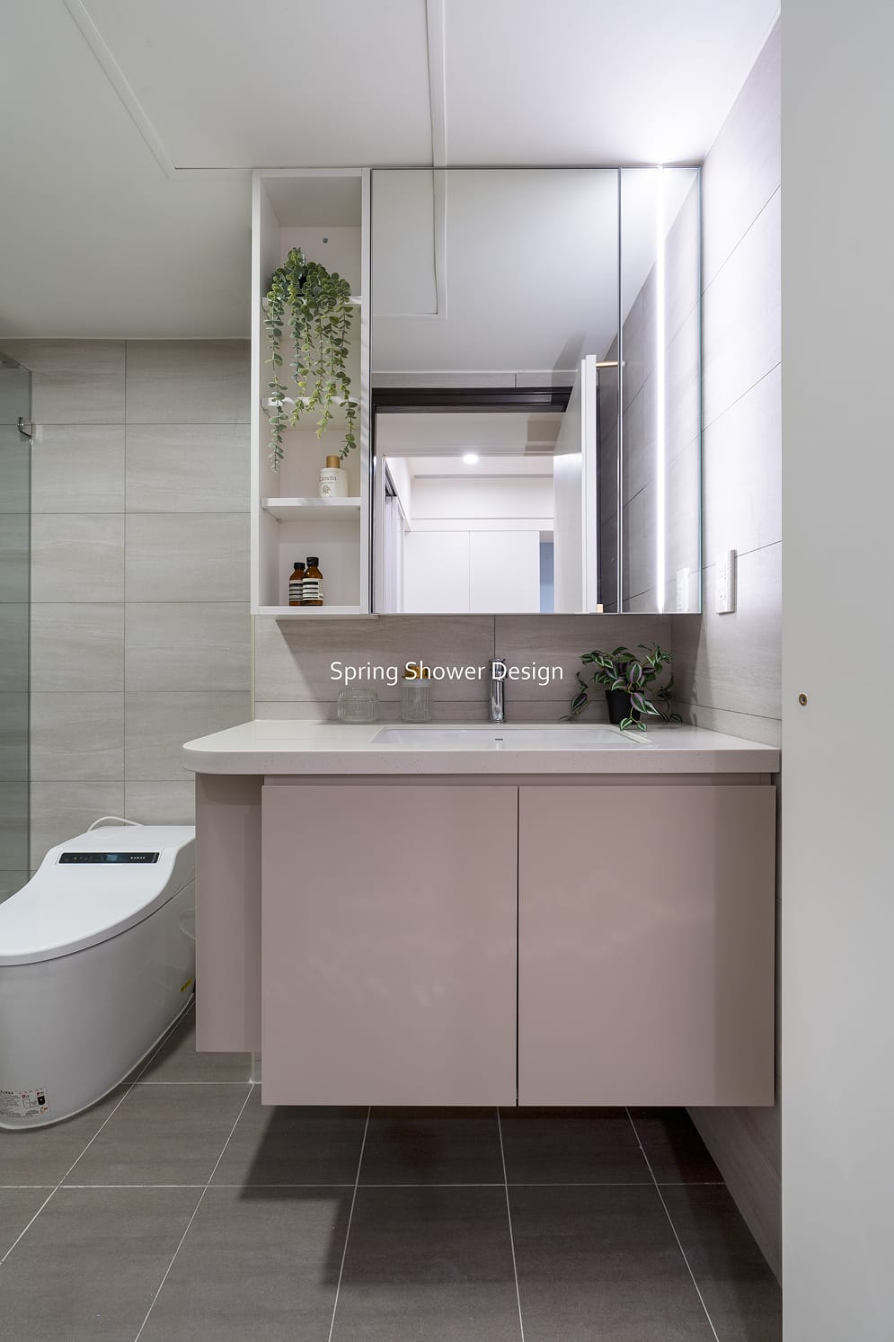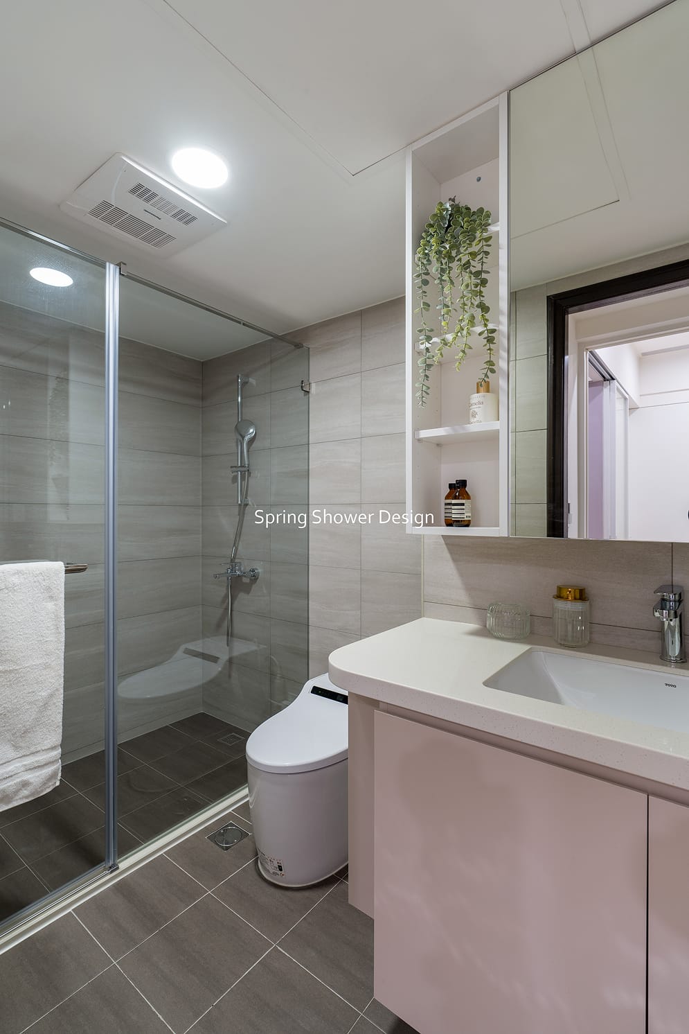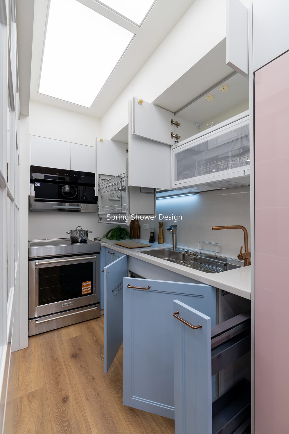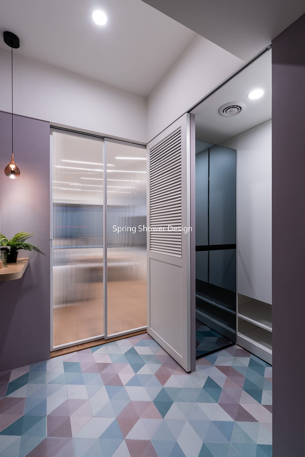 我們將公共空間機能整合為大玄關、大客廳與大廚房,並結合工作與用餐區,讓有限坪數發揮最大坪效;以水洗藍與白色為主軸,搭配超耐磨木地板,讓毛孩自在活動。玄關以屋主喜愛的「丁香紫」為主調,搭配輕美式造型門,規劃「二進式玄關」,區隔大門動線、避免寵物外衝,同時結合落塵區設計,方便毛孩散步回家後清潔腳掌。地坪鋪設丁香紫與水洗藍的彩色六角磚,為空間增添個性層次。玄關後方「隱藏步入式衣帽間」,整合鞋櫃、包包與行李箱收納,並加裝奈米水離子發生器,兼顧空氣品質與寵物健康。