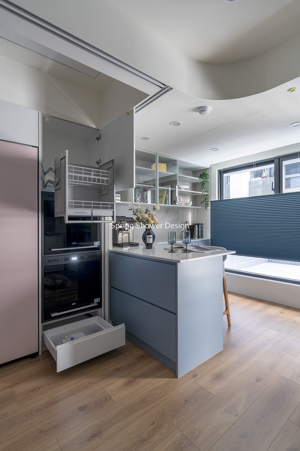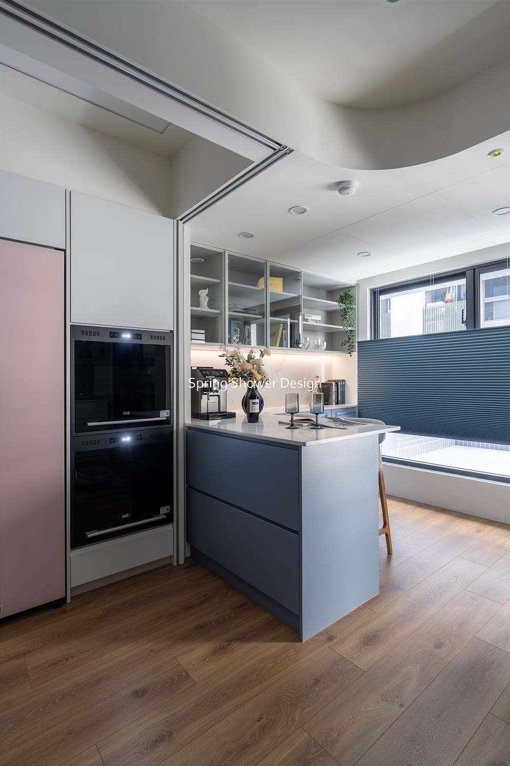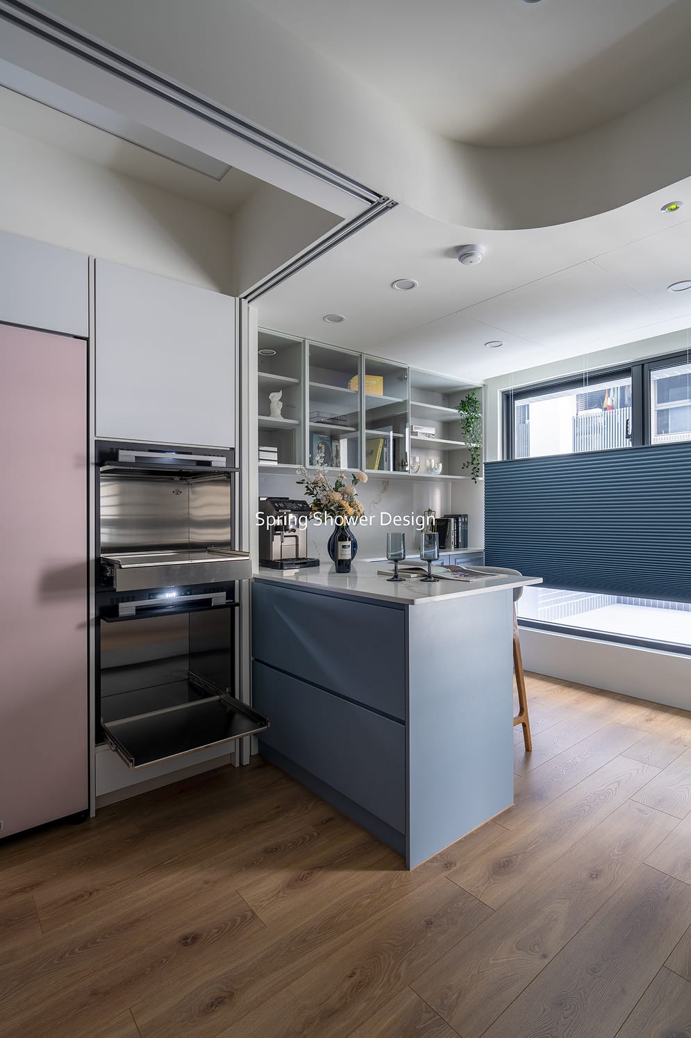 廚房以格子窗鐵件隔間圍塑半開放式大廚房,兼顧油煙阻隔與通透感。超過430公分的料理檯面,完整容納大型烤箱與冷凍設備,搭配流暢動線與耐用中島檯面,讓屋主在料理、生活與陪伴毛小孩之間,享受屬於自己的理想日常!