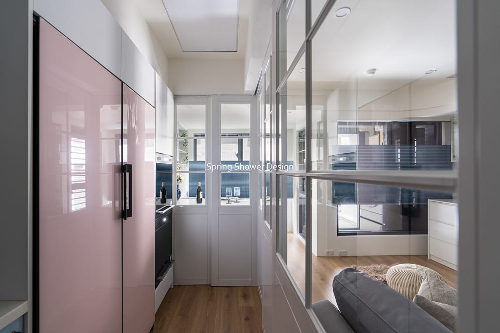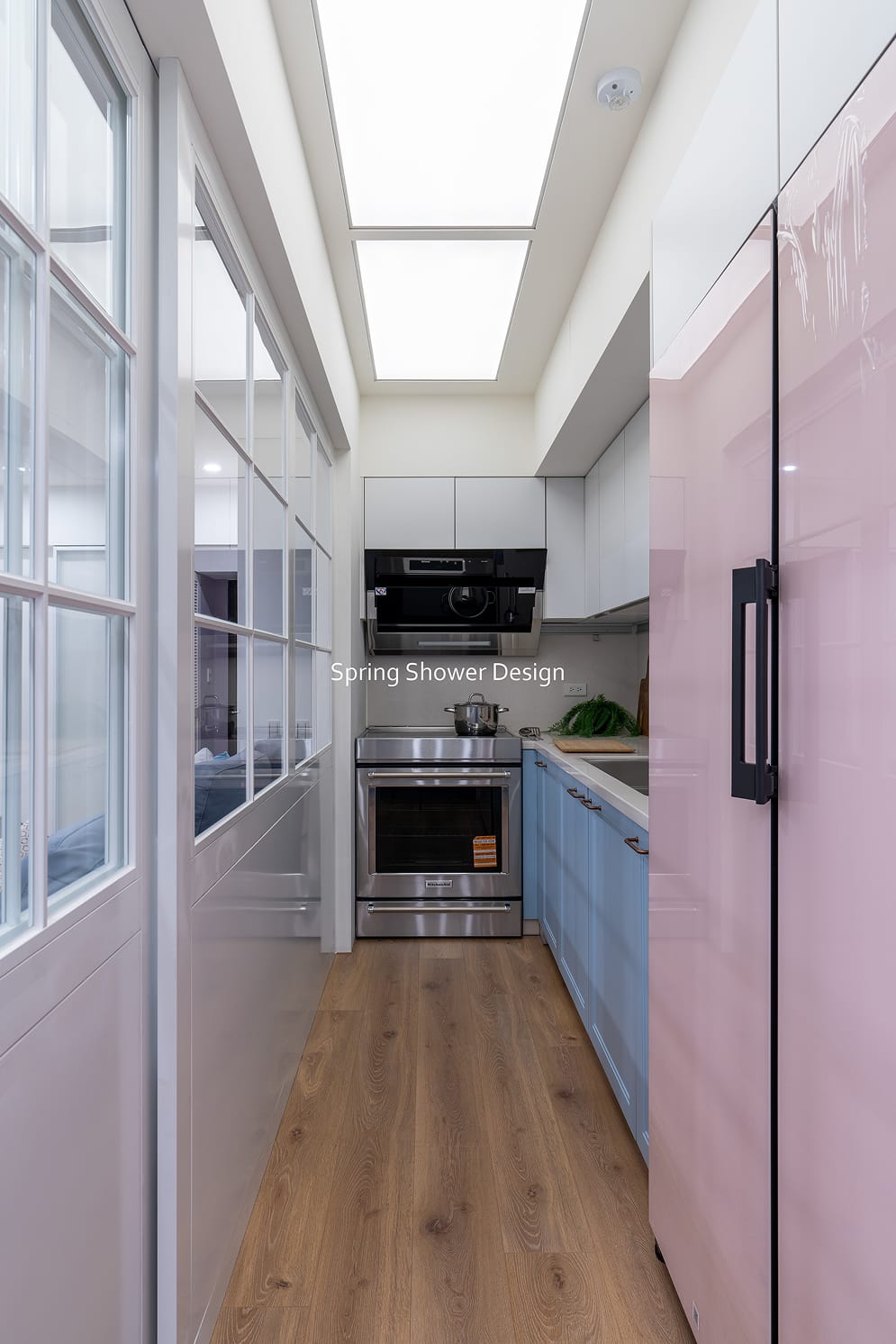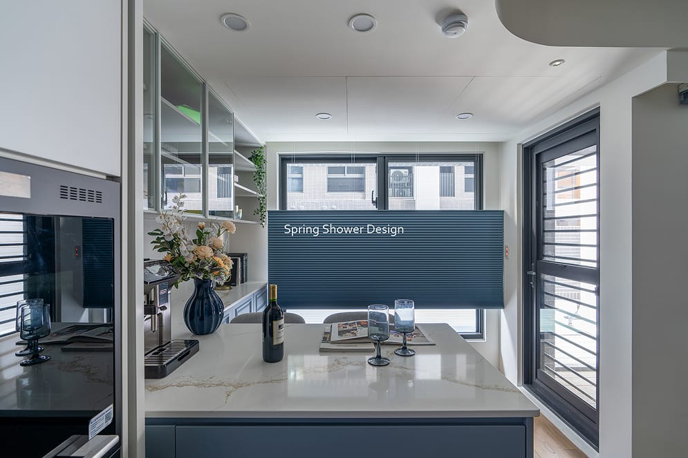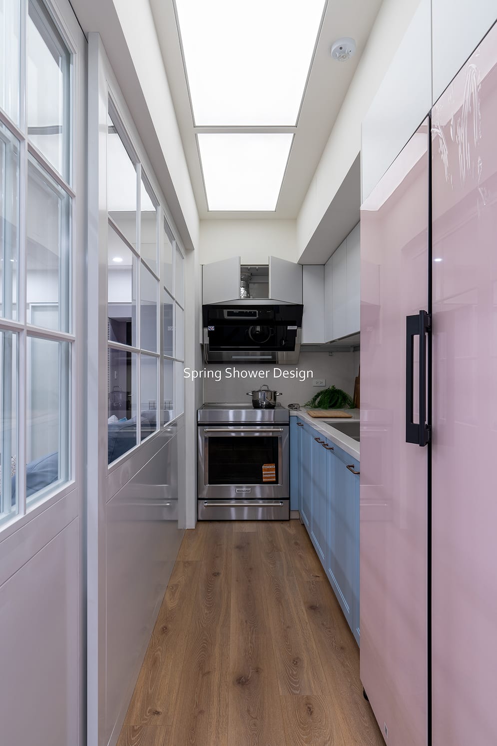 廚房以格子窗鐵件隔間圍塑半開放式大廚房,兼顧油煙阻隔與通透感。超過430公分的料理檯面,完整容納大型烤箱與冷凍設備,搭配流暢動線與耐用中島檯面,讓屋主在料理、生活與陪伴毛小孩之間,享受屬於自己的理想日常!