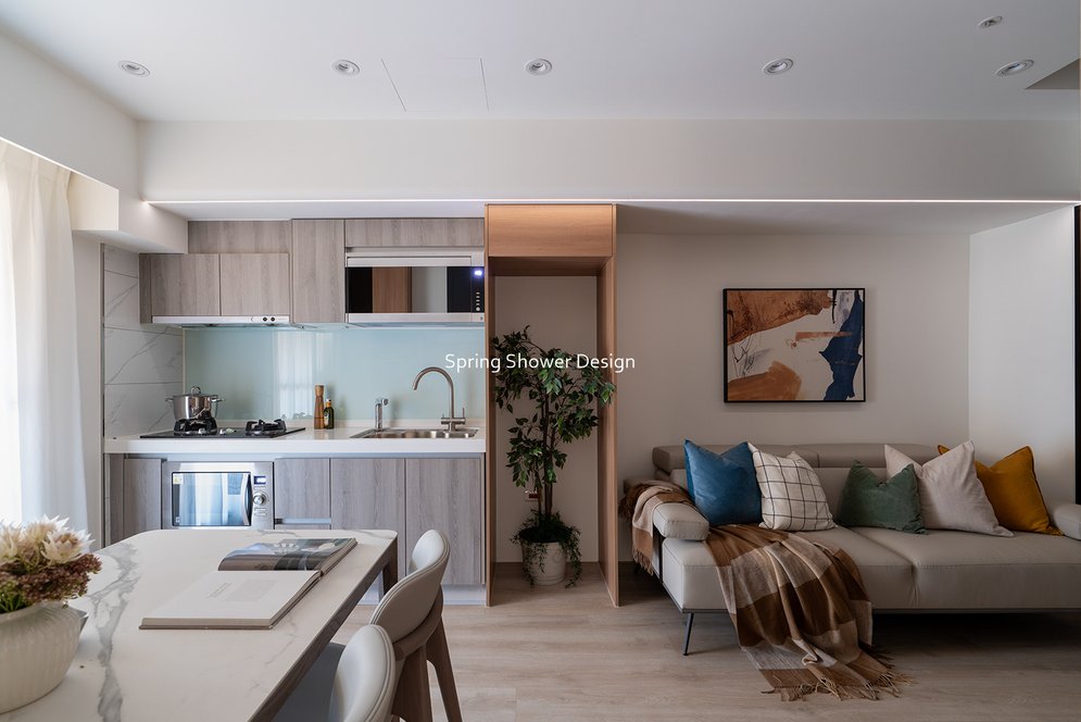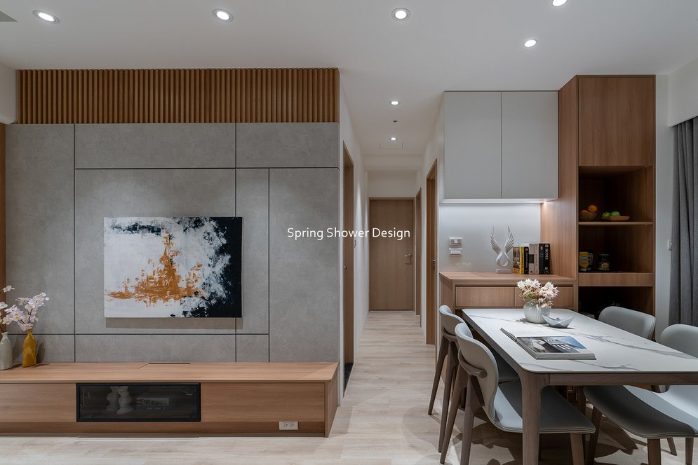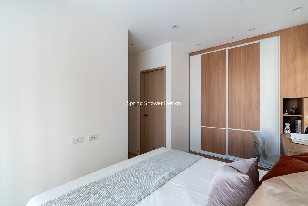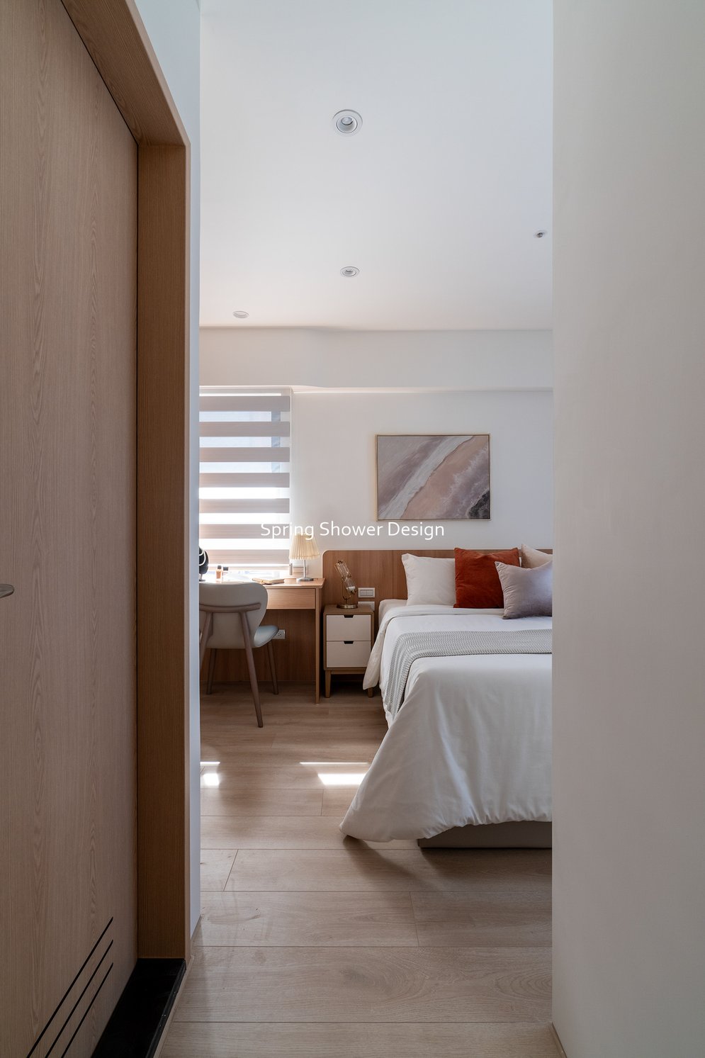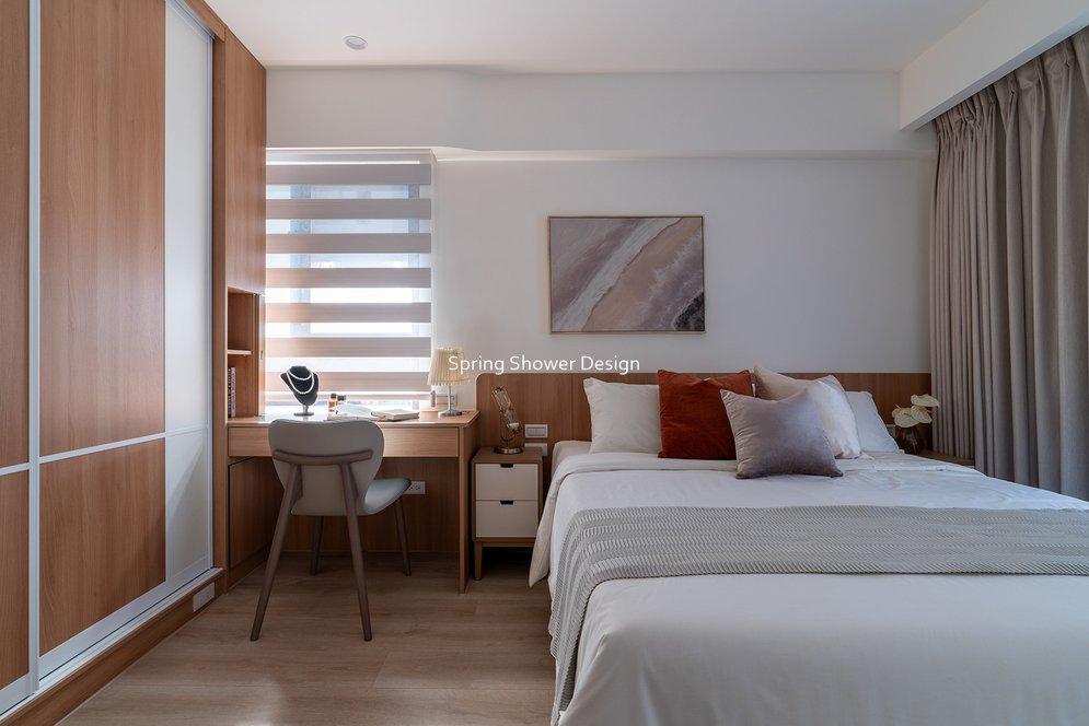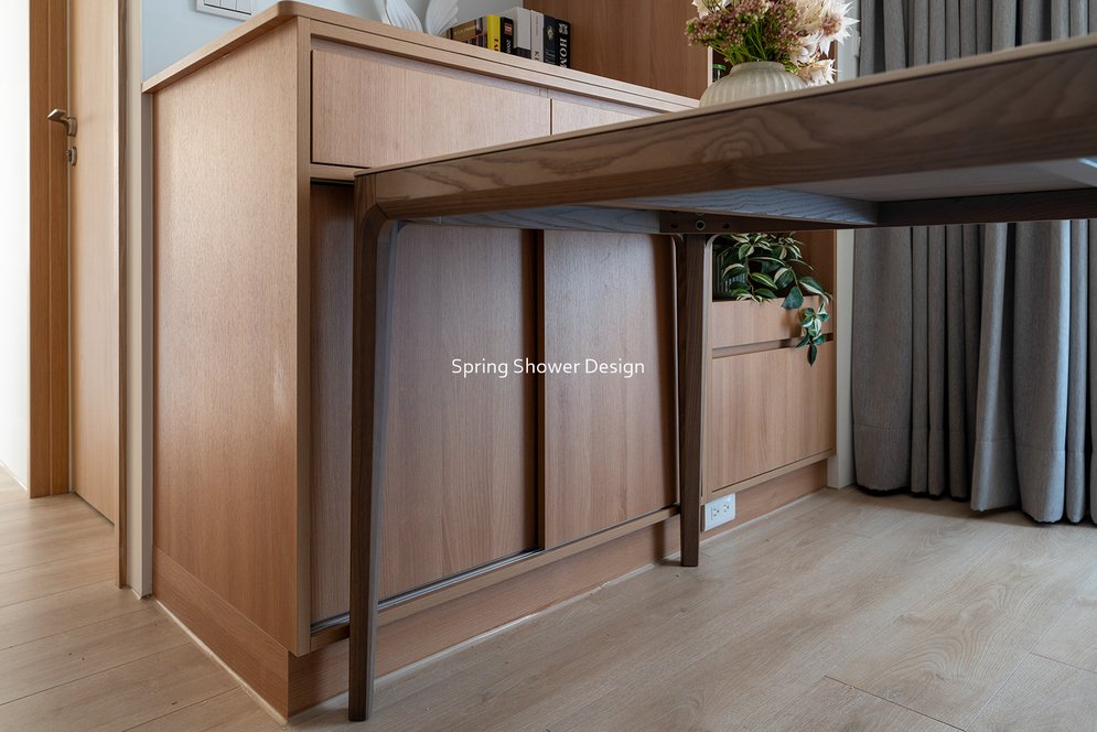客廳主牆運用仿清水模美耐板、暖色木紋與木格柵元素,拉高視覺比例,打造屋主喜愛的日式風格調性。餐廚區保持開放式格局,以同色系系統板規劃冰箱與餐櫃,同時預留餐桌位置,維持整體感。主臥室3.7坪,延續公區木紋氛圍,從床頭延伸至化妝桌與衣櫃,加入完整收納功能。整個家透過量身訂製的櫃體規劃,提供高彈性收納,讓日式小清新的風格與實用機能兼具,實現既簡約又整齊的居家生活!