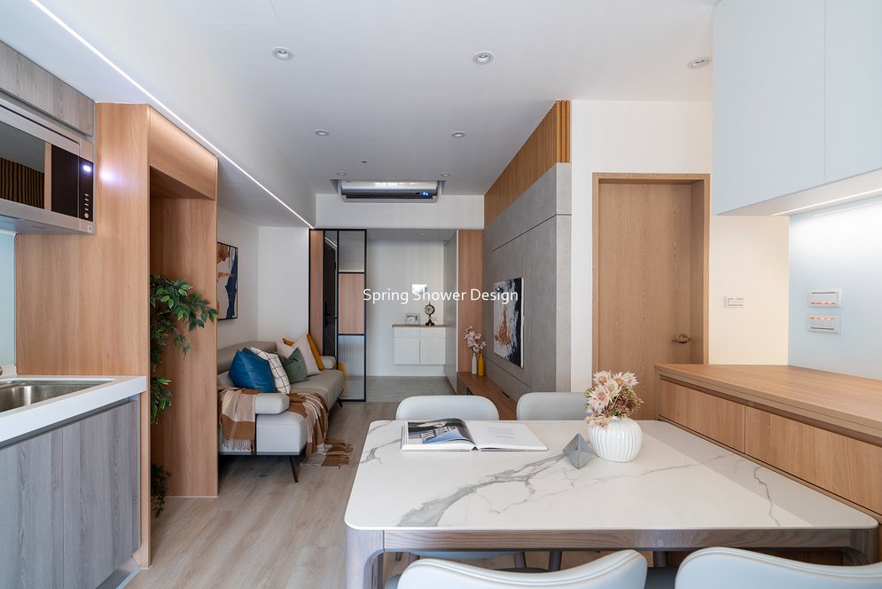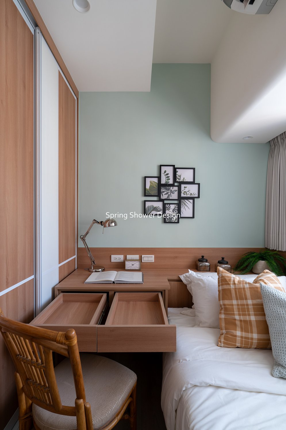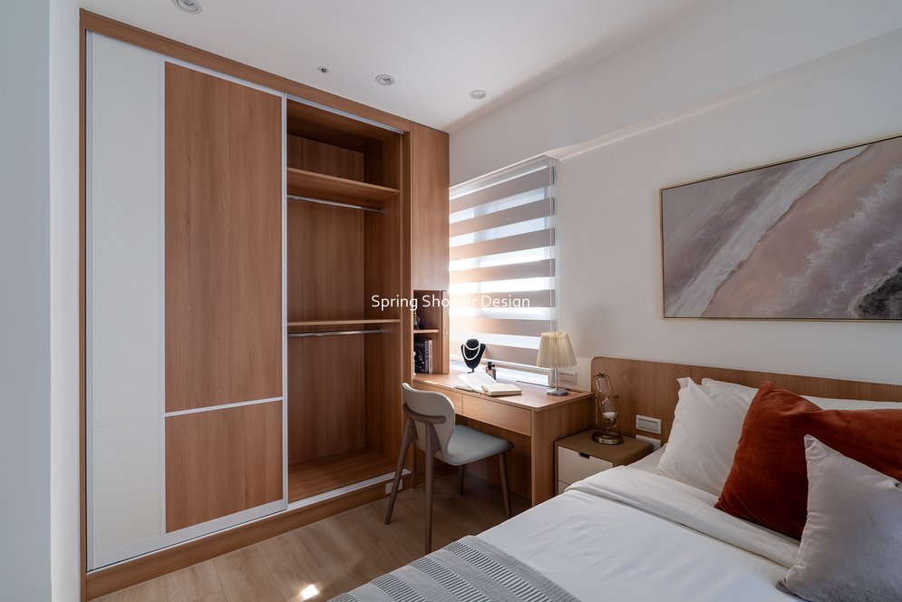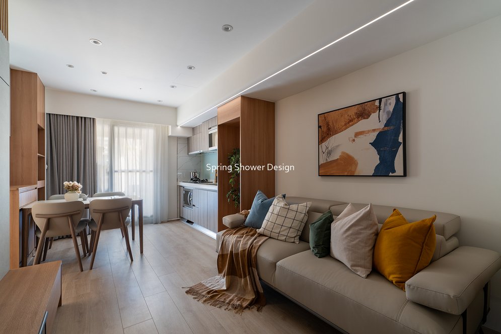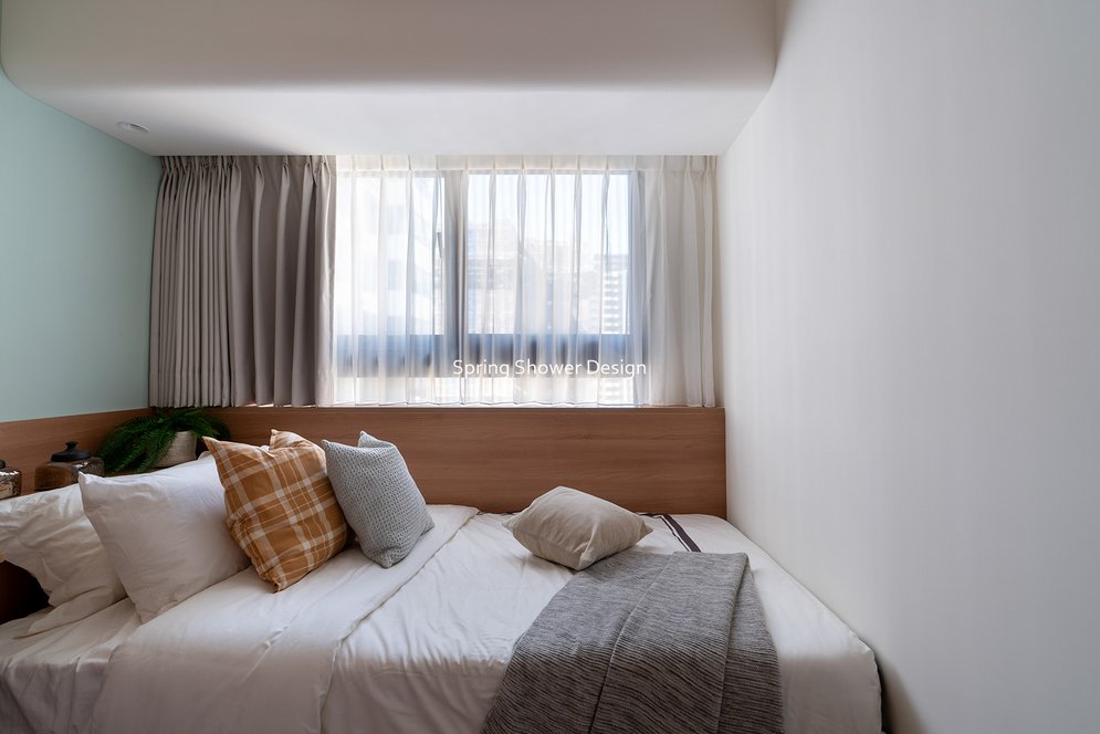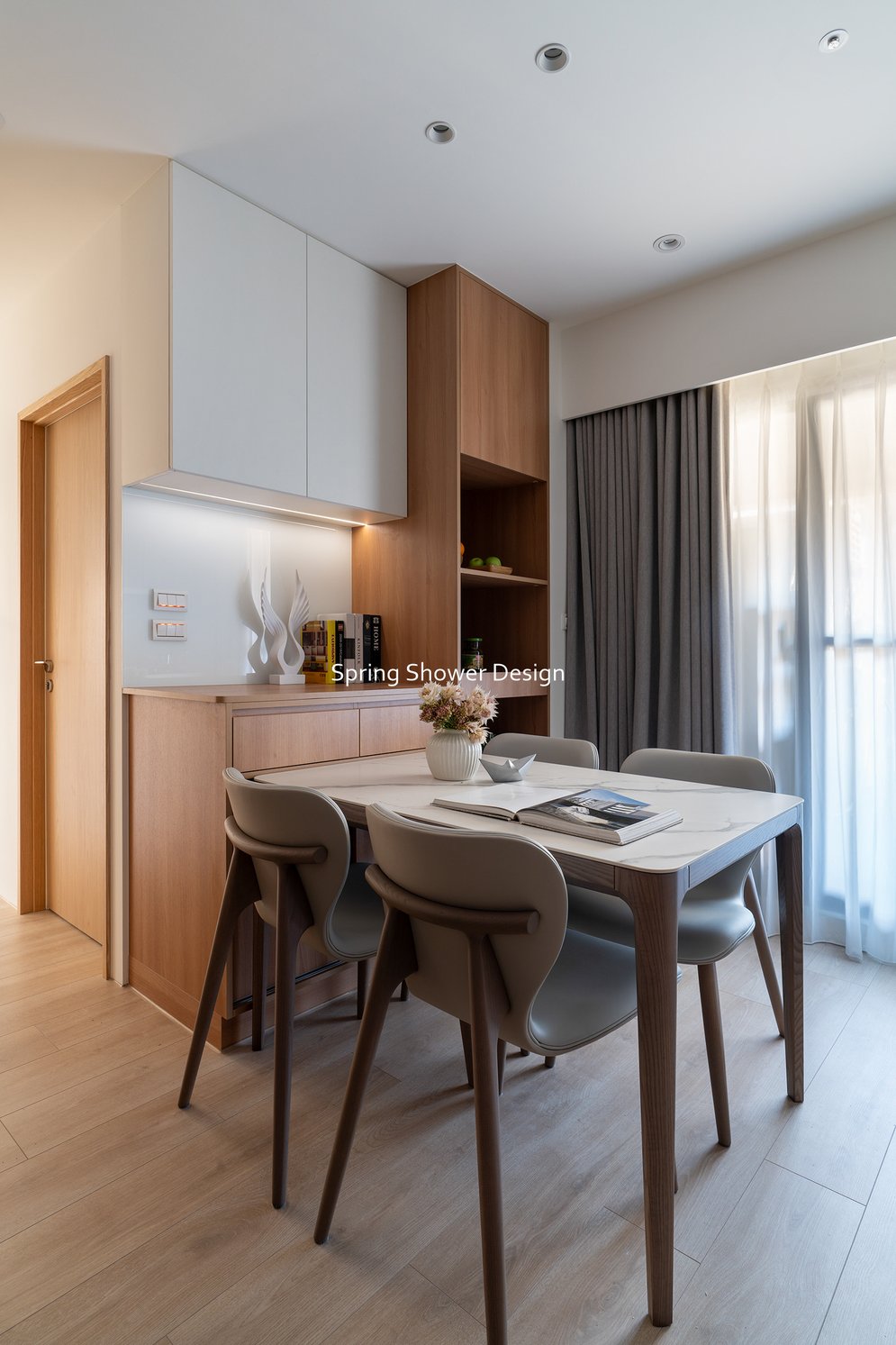 客廳主牆運用仿清水模美耐板、暖色木紋與木格柵元素,拉高視覺比例,打造屋主喜愛的日式風格調性。餐廚區保持開放式格局,以同色系系統板規劃冰箱與餐櫃,同時預留餐桌位置,維持整體感。主臥室3.7坪,延續公區木紋氛圍,從床頭延伸至化妝桌與衣櫃,加入完整收納功能。整個家透過量身訂製的櫃體規劃,提供高彈性收納,讓日式小清新的風格與實用機能兼具,實現既簡約又整齊的居家生活!