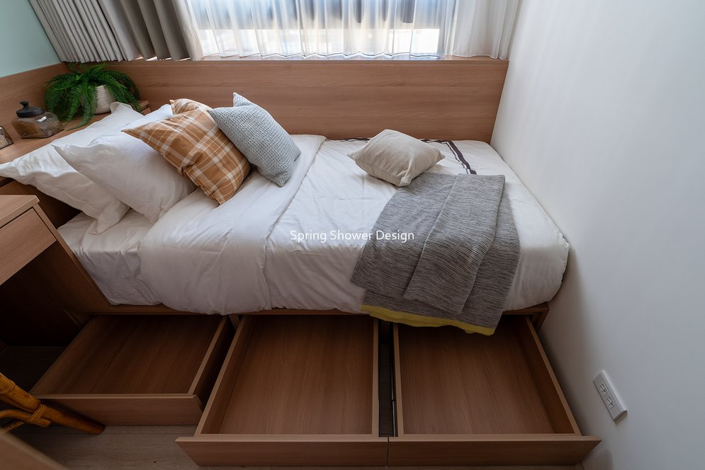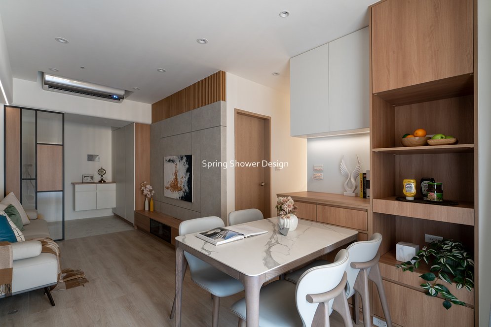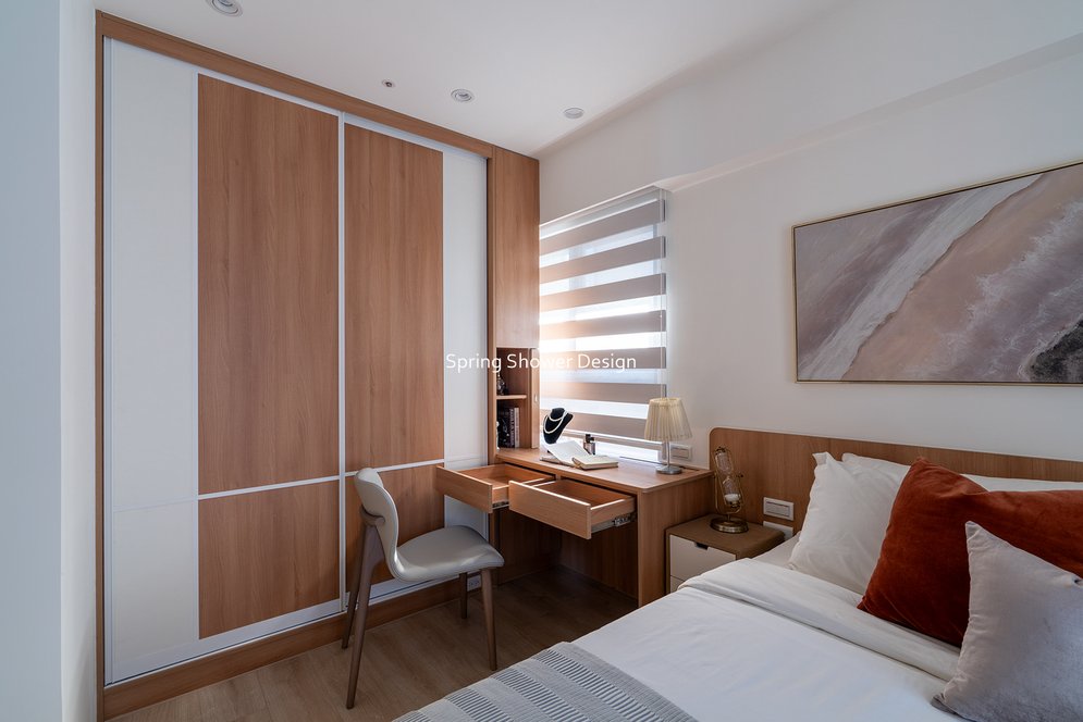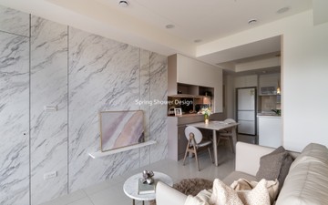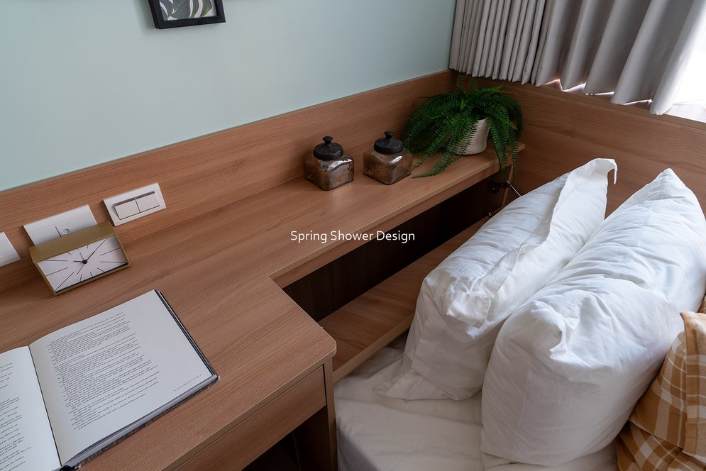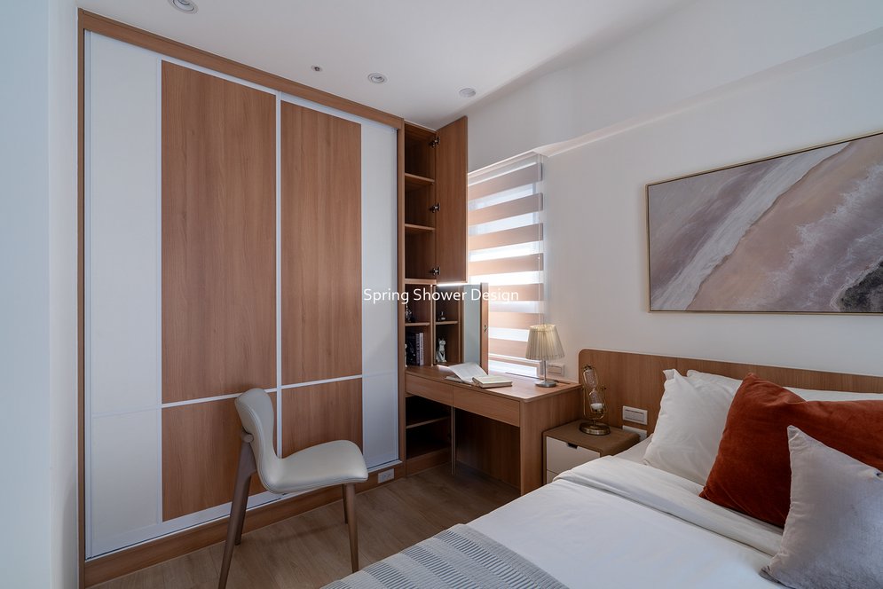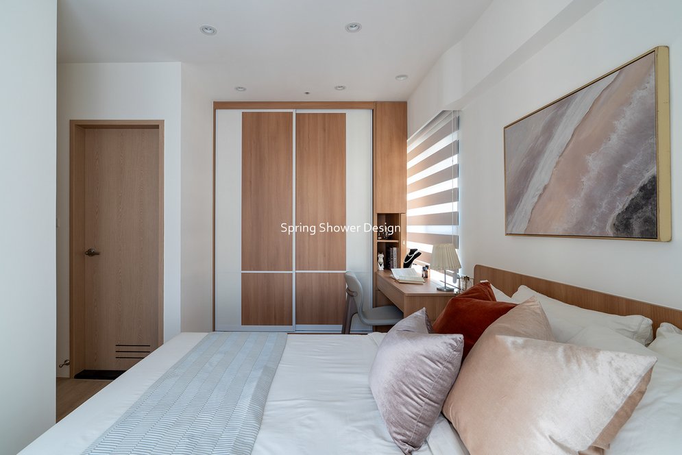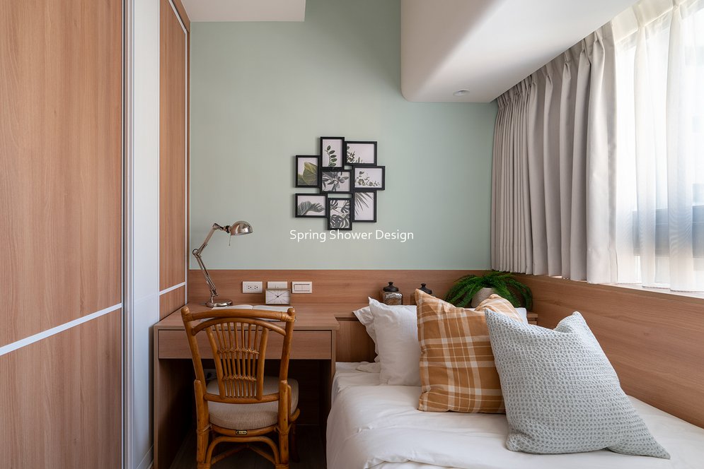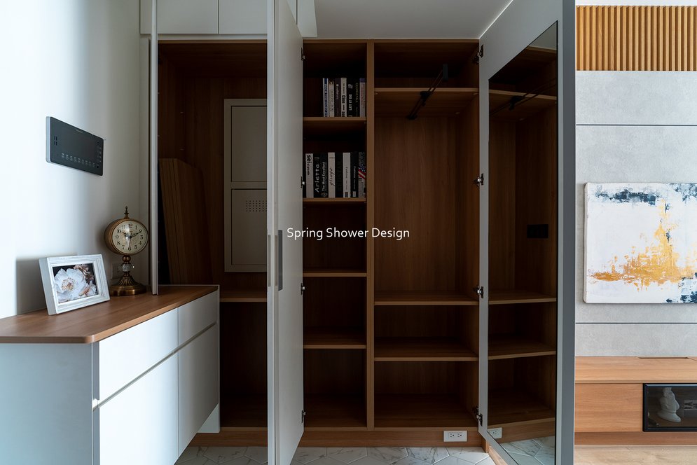 客廳主牆運用仿清水模美耐板、暖色木紋與木格柵元素,拉高視覺比例,打造屋主喜愛的日式風格調性。餐廚區保持開放式格局,以同色系系統板規劃冰箱與餐櫃,同時預留餐桌位置,維持整體感。主臥室3.7坪,延續公區木紋氛圍,從床頭延伸至化妝桌與衣櫃,加入完整收納功能。整個家透過量身訂製的櫃體規劃,提供高彈性收納,讓日式小清新的風格與實用機能兼具,實現既簡約又整齊的居家生活!