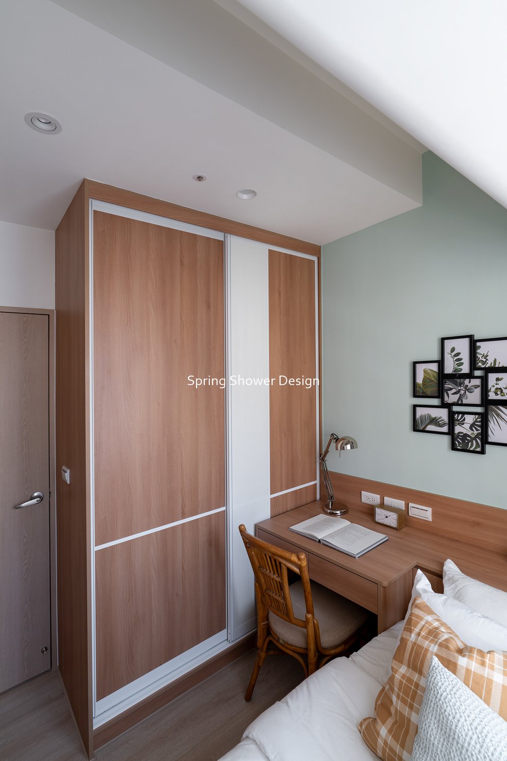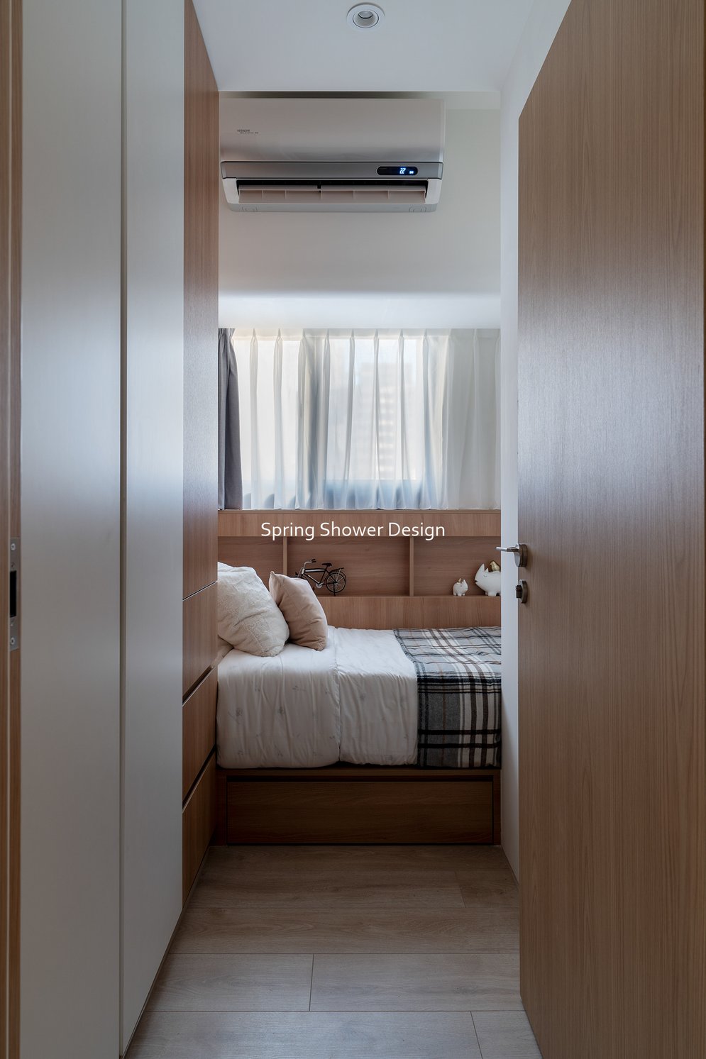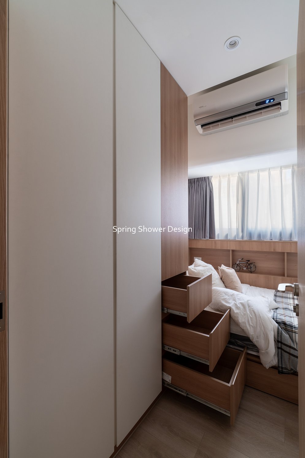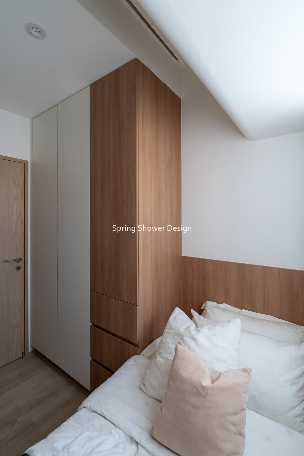 客廳主牆運用仿清水模美耐板、暖色木紋與木格柵元素,拉高視覺比例,打造屋主喜愛的日式風格調性。餐廚區保持開放式格局,以同色系系統板規劃冰箱與餐櫃,同時預留餐桌位置,維持整體感。主臥室3.7坪,延續公區木紋氛圍,從床頭延伸至化妝桌與衣櫃,加入完整收納功能。整個家透過量身訂製的櫃體規劃,提供高彈性收納,讓日式小清新的風格與實用機能兼具,實現既簡約又整齊的居家生活!