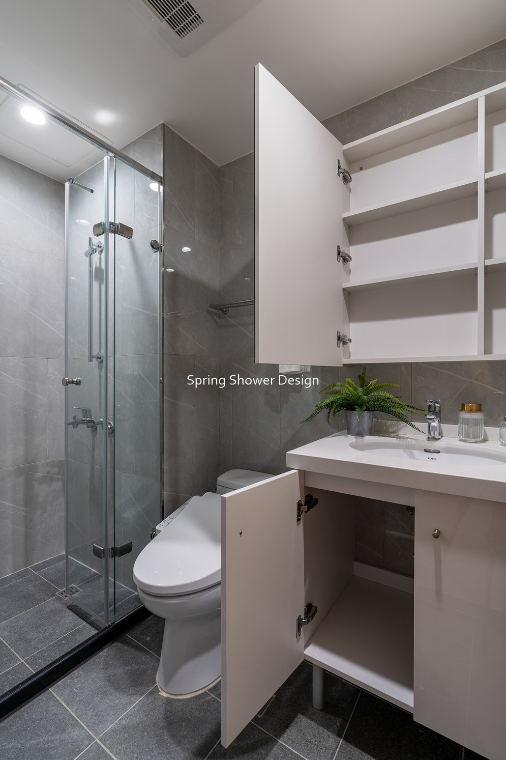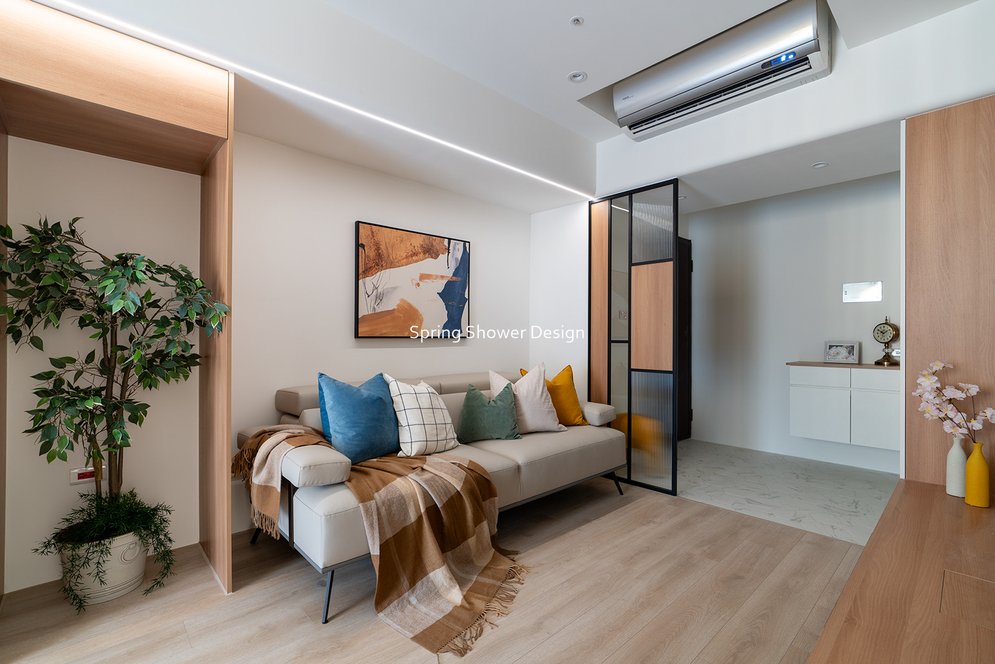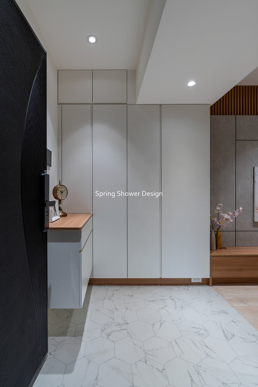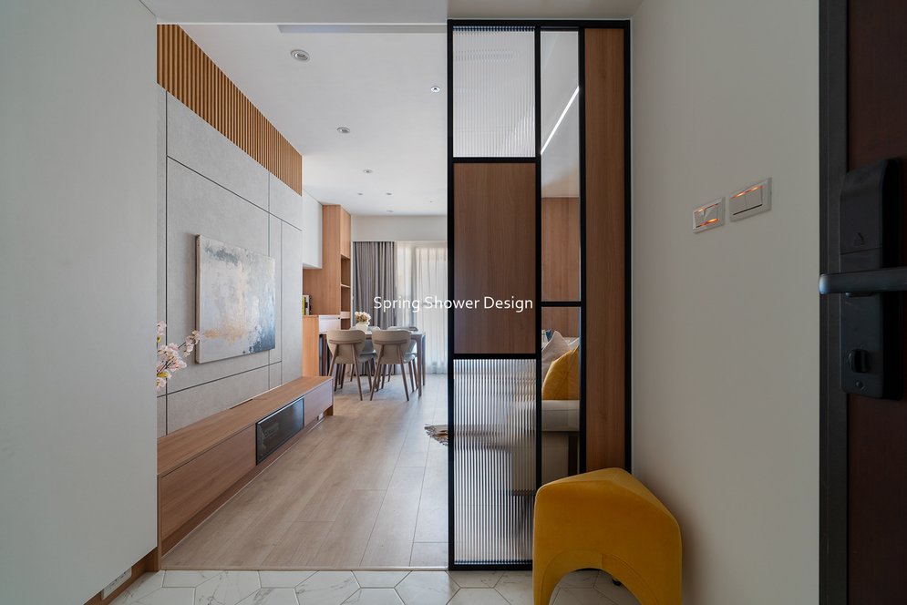 這是屋主一家三口的家,以「日式無印風」為主軸,加入量身訂製的收納規劃,兼具實用與輕量感,保持一家人喜歡的簡約氛圍。玄關採L型組織收納,高鞋櫃、專屬汙衣櫃以及行李箱位置;落塵區以「銀狐石紋六角磚」銜接超耐磨木地板,兼顧美觀與耐用。屏風設計運用黑色鐵件、木紋色板與玻璃材質,虛實交錯,增添日式氛圍,同時界定空間。