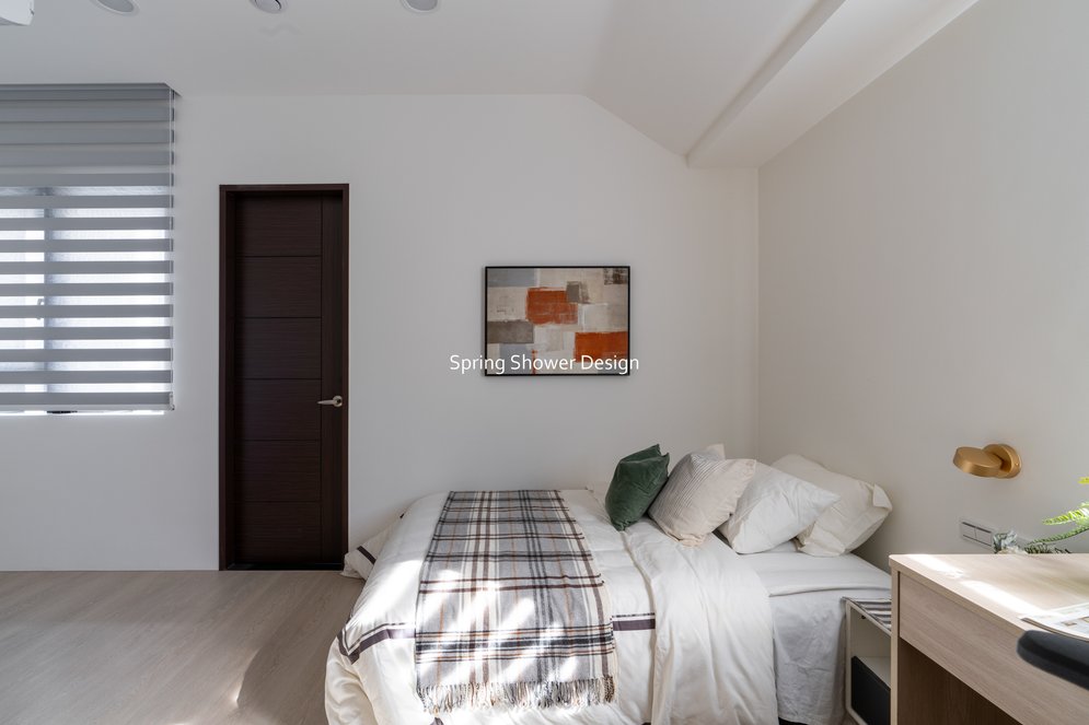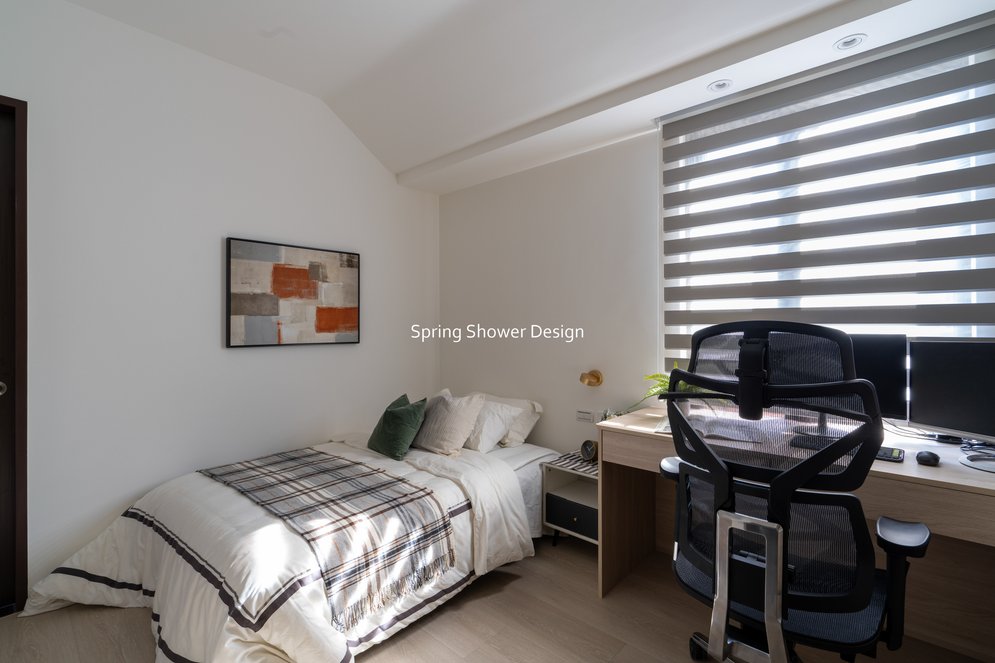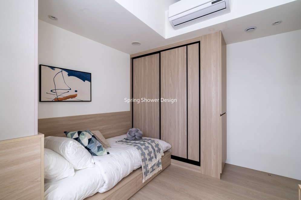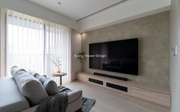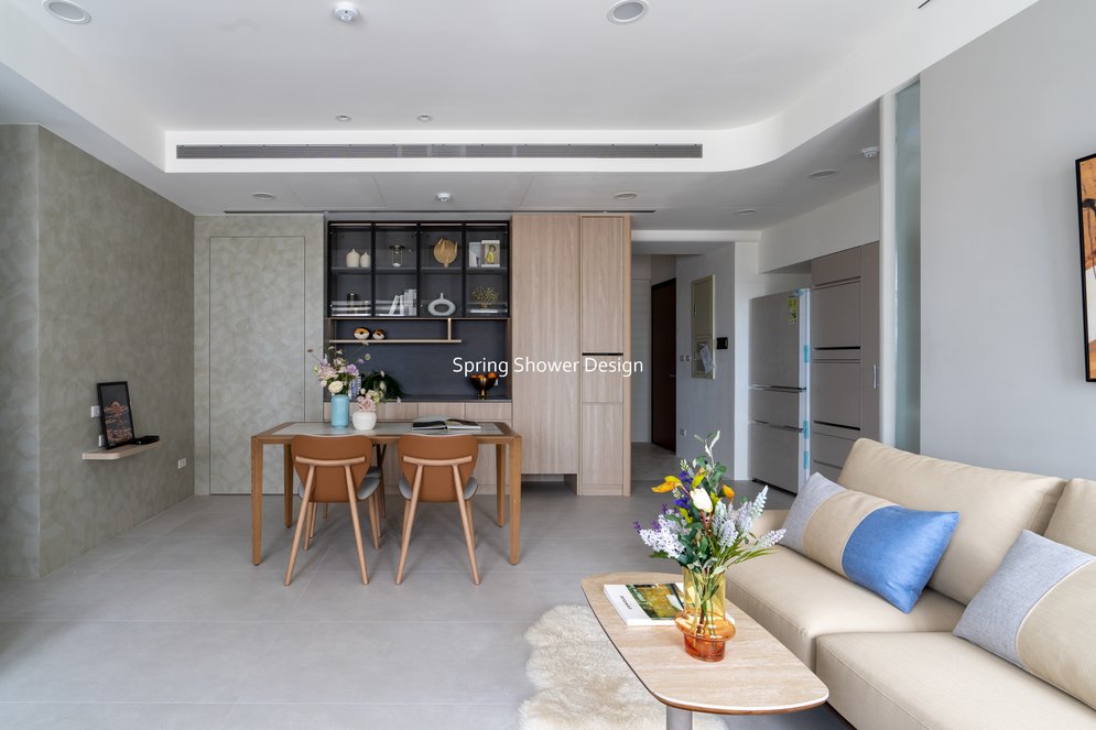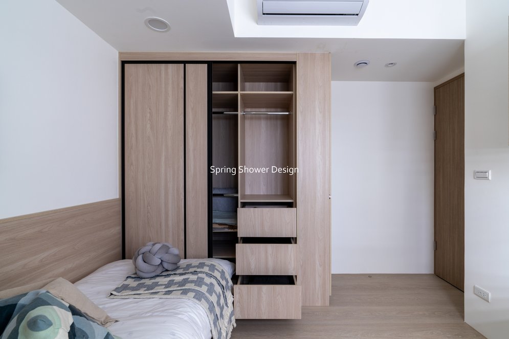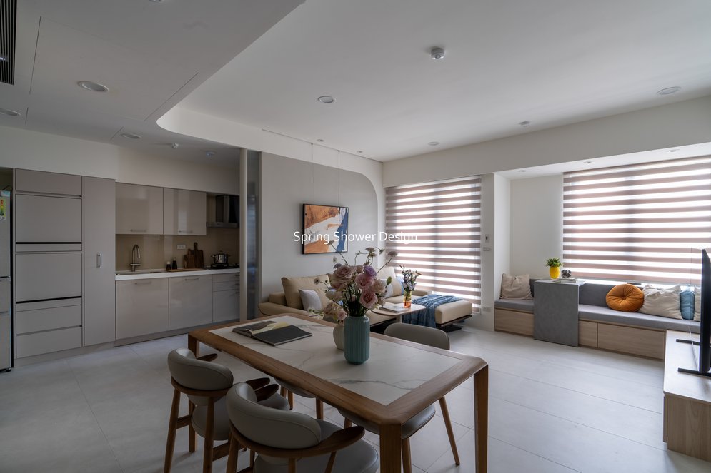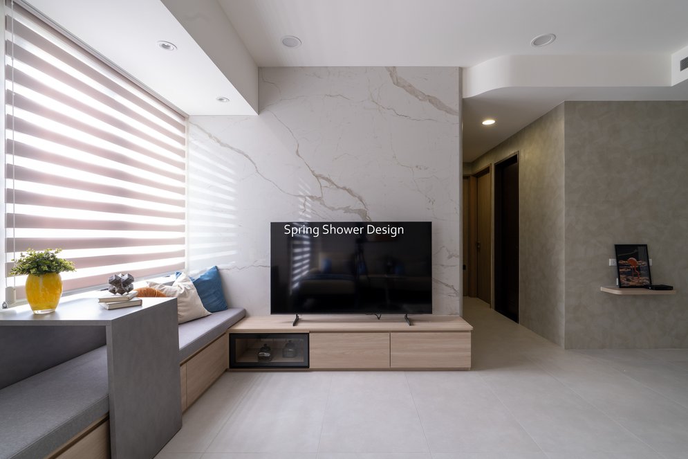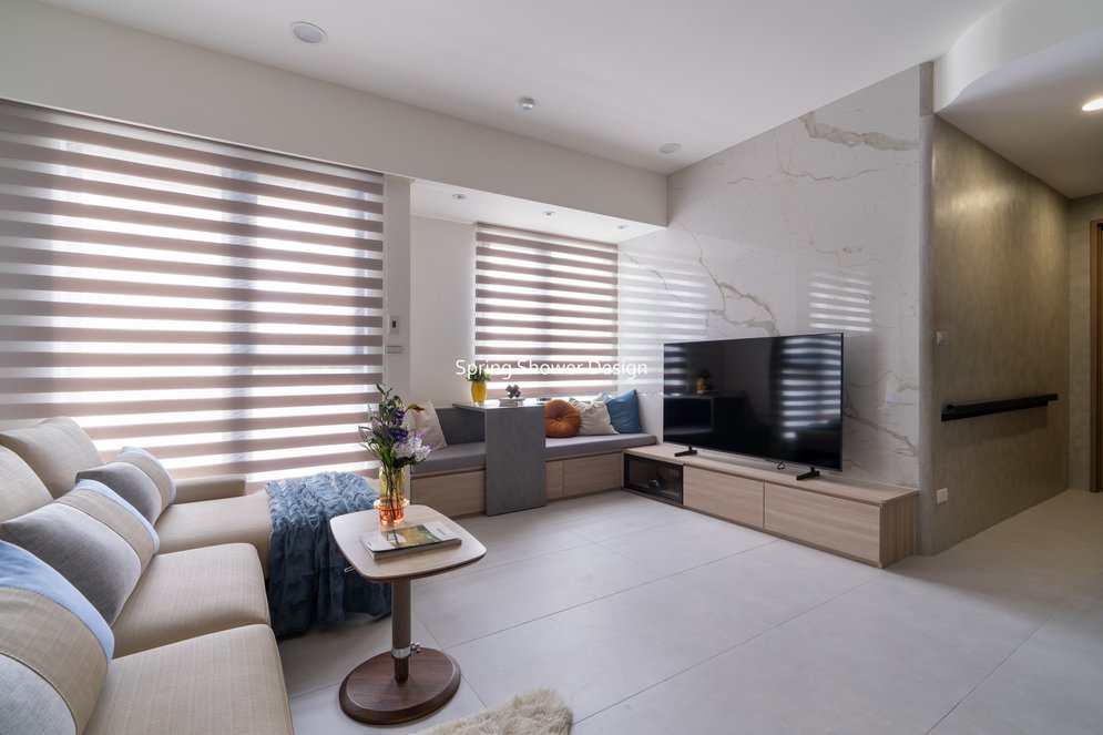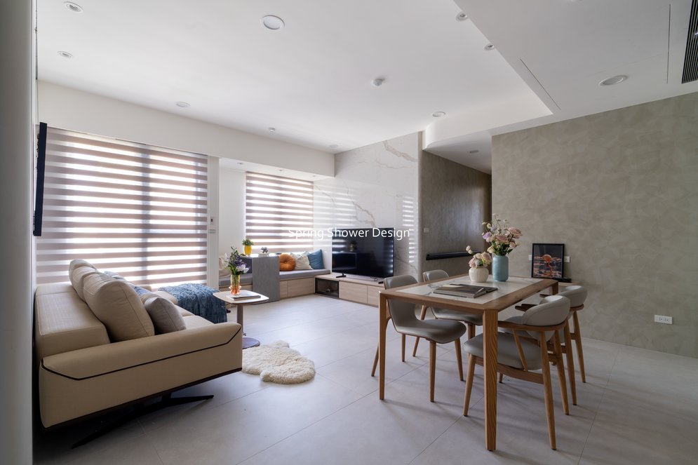 餐廳、客廳與廚房採光充足,延續開放式廚房格局,加入直立式電器櫃與冰箱收納。客廳電視牆選用大板磚,挑高無接縫,底部延伸電視櫃與臥榻,維持視野通透,L型沙發區面向窗景,讓光線與景觀融入生活。主臥室規劃更衣室與儲藏室,睡眠、收納、化妝區空間分明。更衣室設計吊衣與包包收納,冬衣與寢具可以分門別類收納,保持整齊。主浴室門向調整,採水磨石壁磚跳色,淋浴區新增鏡櫃收納,兼顧美感與實用性。兒子房規劃書桌、展示櫃、床位與衣櫃,空間依需求靈活運用;男主人房則保留充足收納與舒適睡眠區。整體設計以公共與私領域分明、光線通透、收納充足為核心,為屋主一家人量身訂製專屬宅。