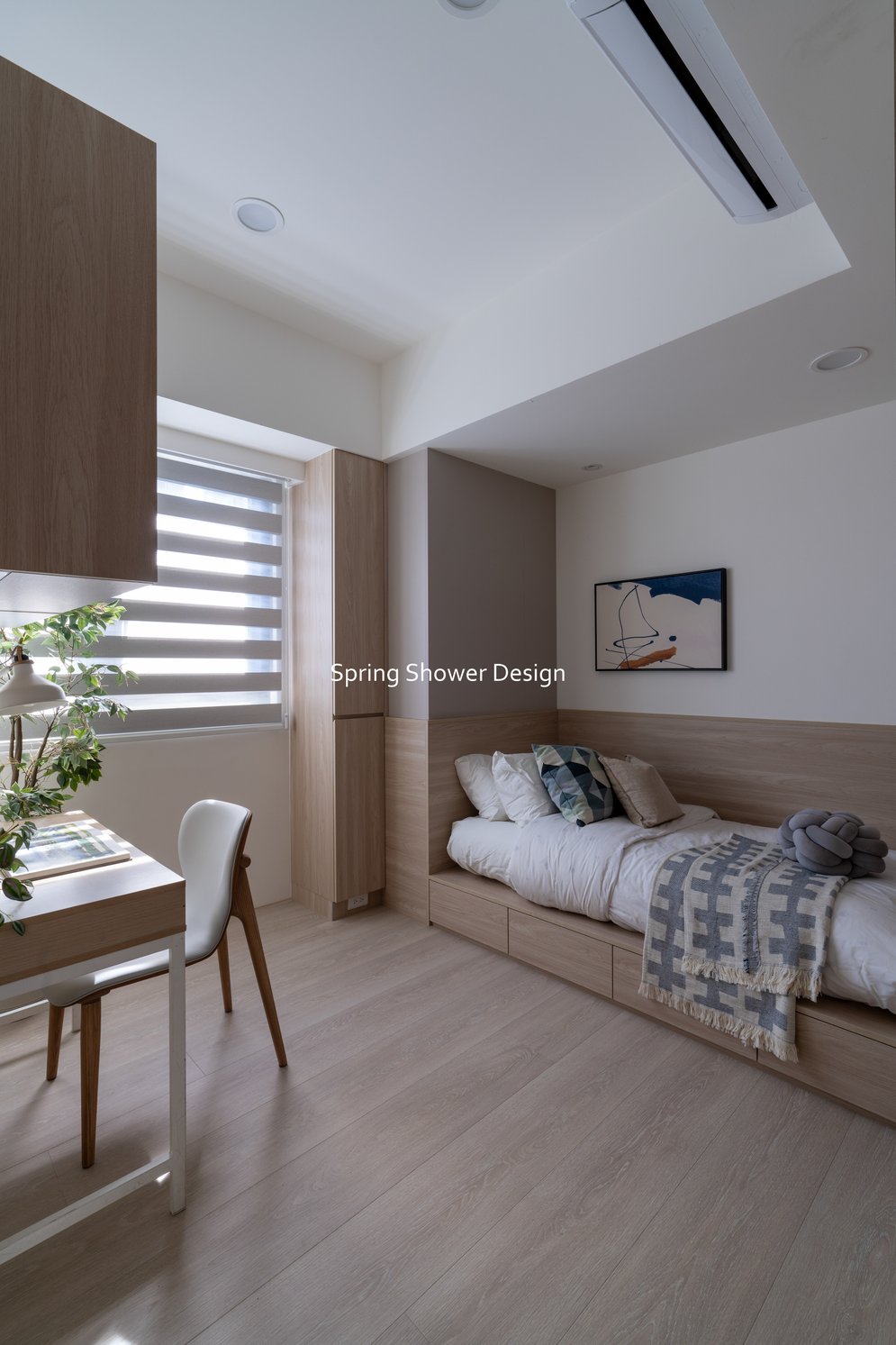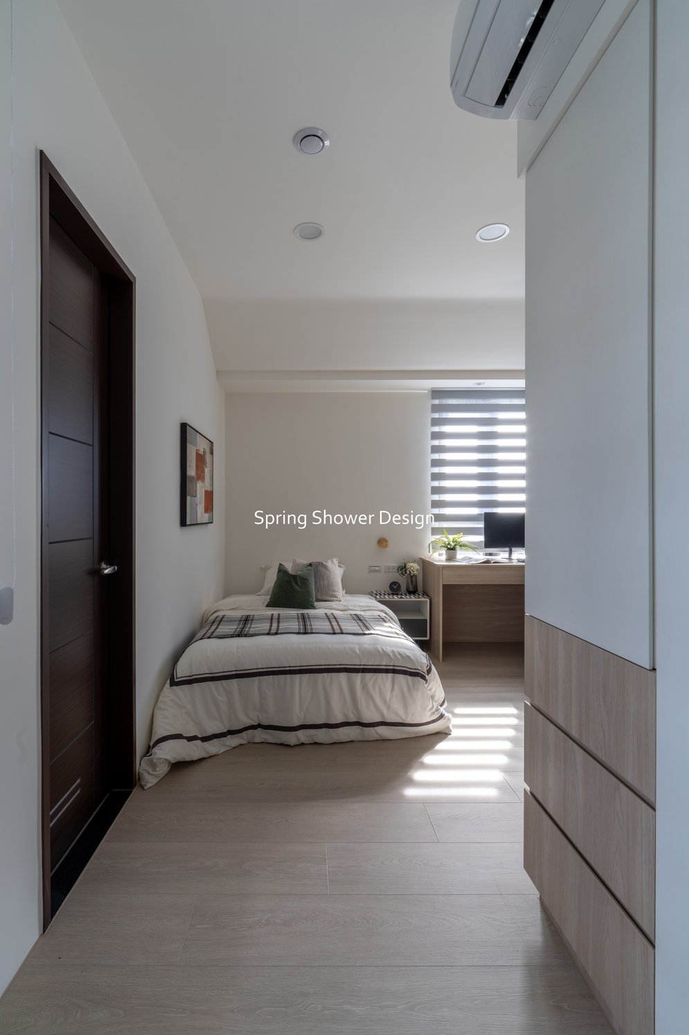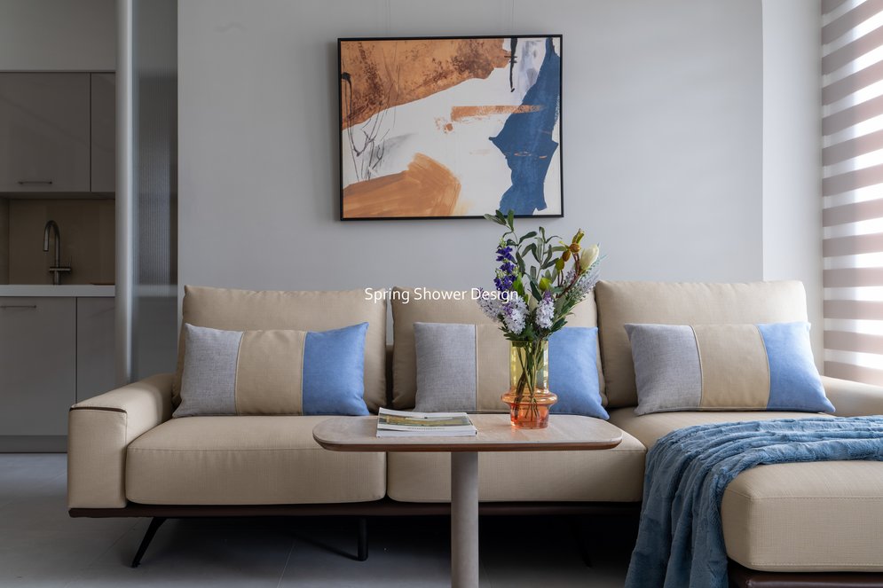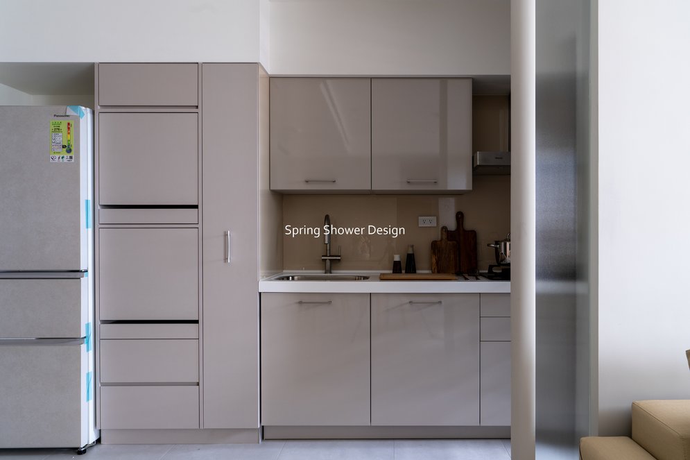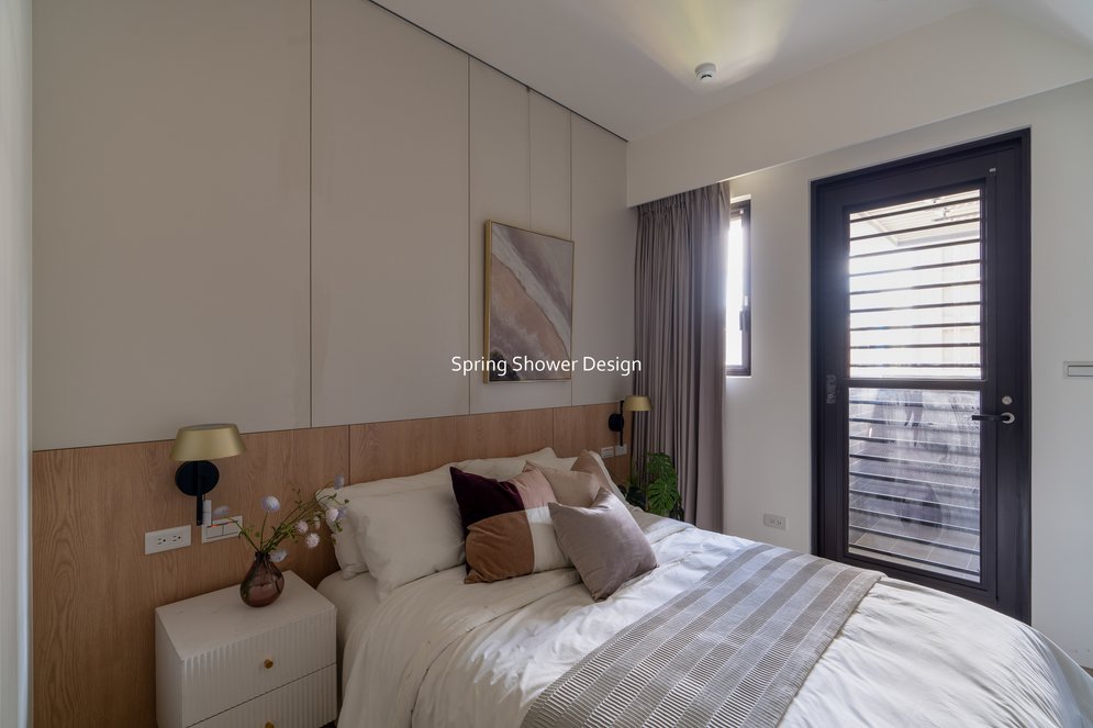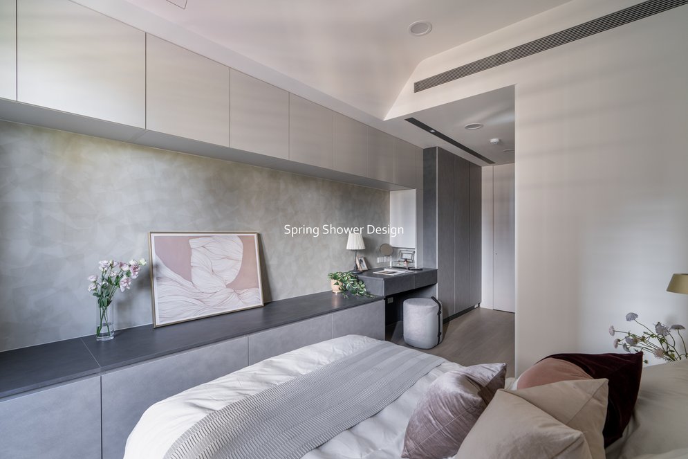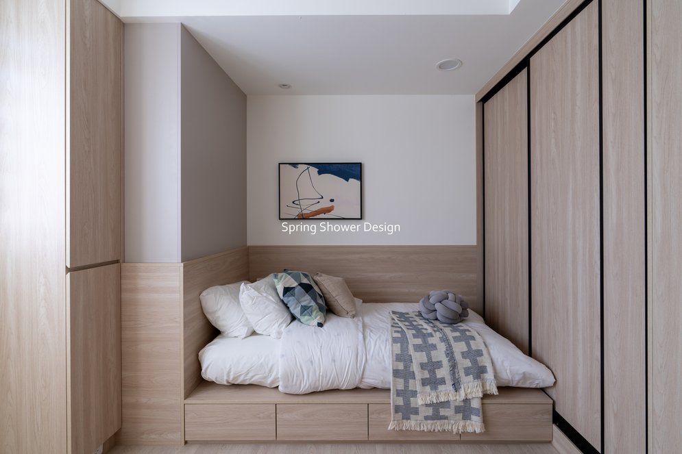 餐廳、客廳與廚房採光充足,延續開放式廚房格局,加入直立式電器櫃與冰箱收納。客廳電視牆選用大板磚,挑高無接縫,底部延伸電視櫃與臥榻,維持視野通透,L型沙發區面向窗景,讓光線與景觀融入生活。主臥室規劃更衣室與儲藏室,睡眠、收納、化妝區空間分明。更衣室設計吊衣與包包收納,冬衣與寢具可以分門別類收納,保持整齊。主浴室門向調整,採水磨石壁磚跳色,淋浴區新增鏡櫃收納,兼顧美感與實用性。兒子房規劃書桌、展示櫃、床位與衣櫃,空間依需求靈活運用;男主人房則保留充足收納與舒適睡眠區。整體設計以公共與私領域分明、光線通透、收納充足為核心,為屋主一家人量身訂製專屬宅。