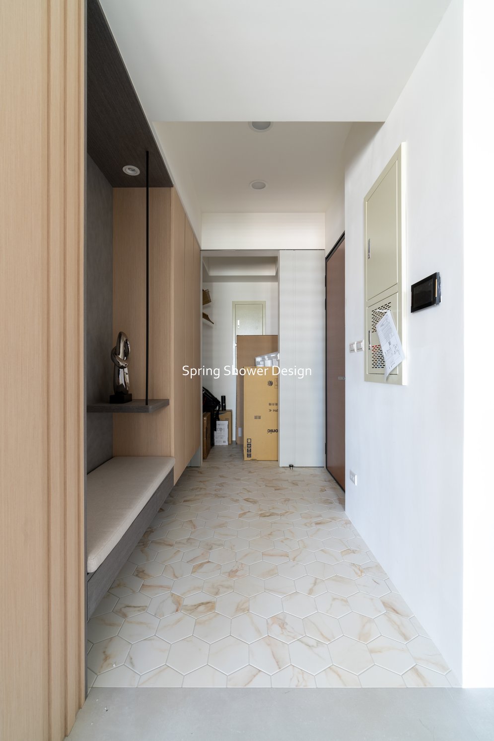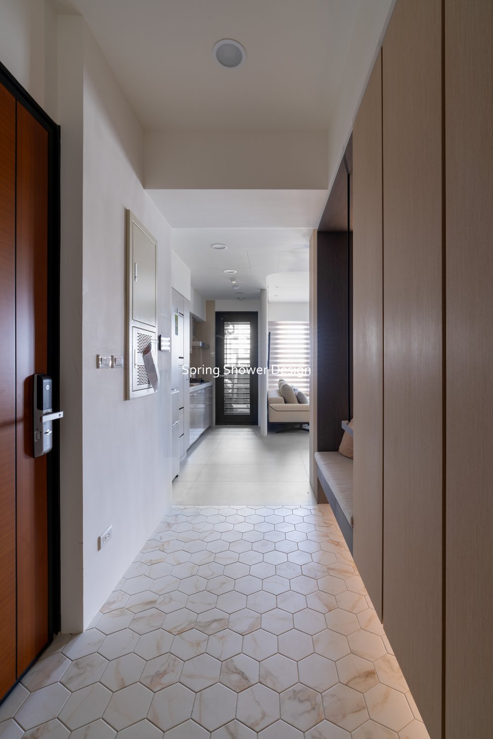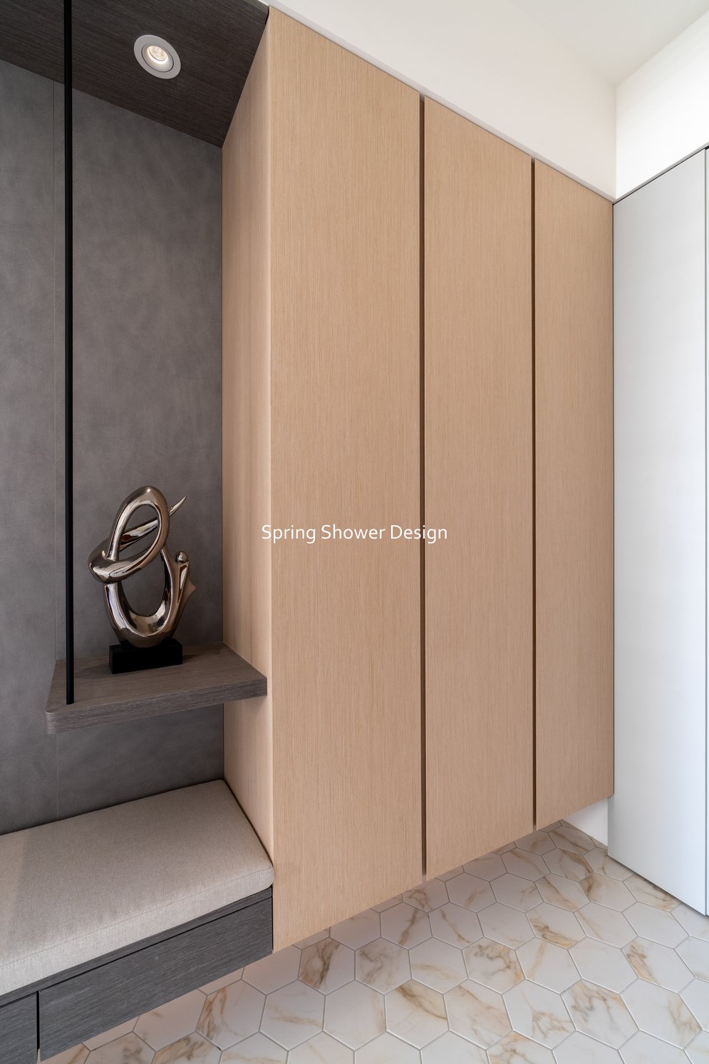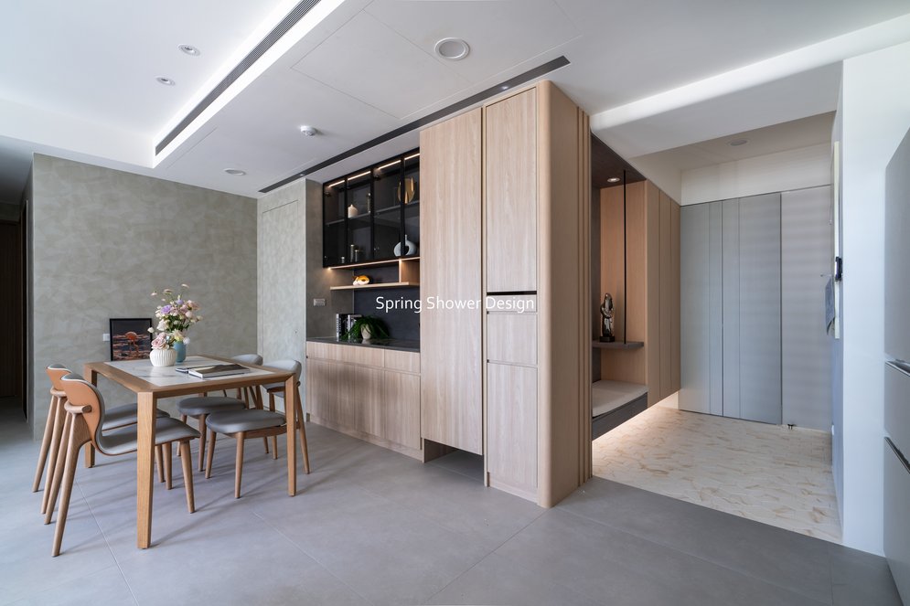 這是一個兩戶合併的家,我們保留三間衛浴與兩個廚房,重新規劃格局與收納,讓公共空間方正明亮,私領域舒適實用。玄關空間巧妙利用原本的長型格局,一分為二:前半部作為衣帽間,與新玄關互通,後半部成為主臥更衣室。隔間採用陶粒牆,增加隔音效果;鞋櫃、穿鞋椅與隱藏鏡面設計,兼顧美觀與使用便利。