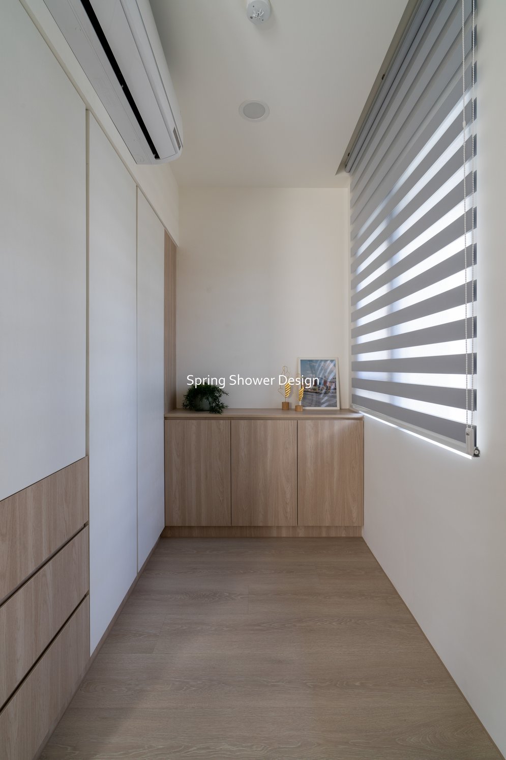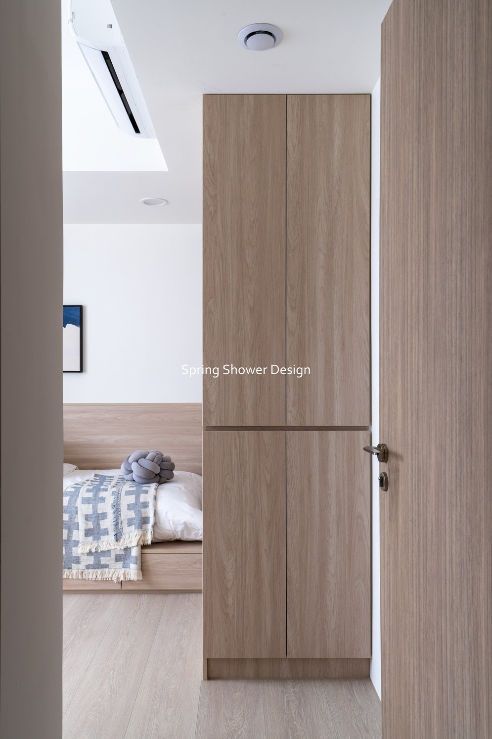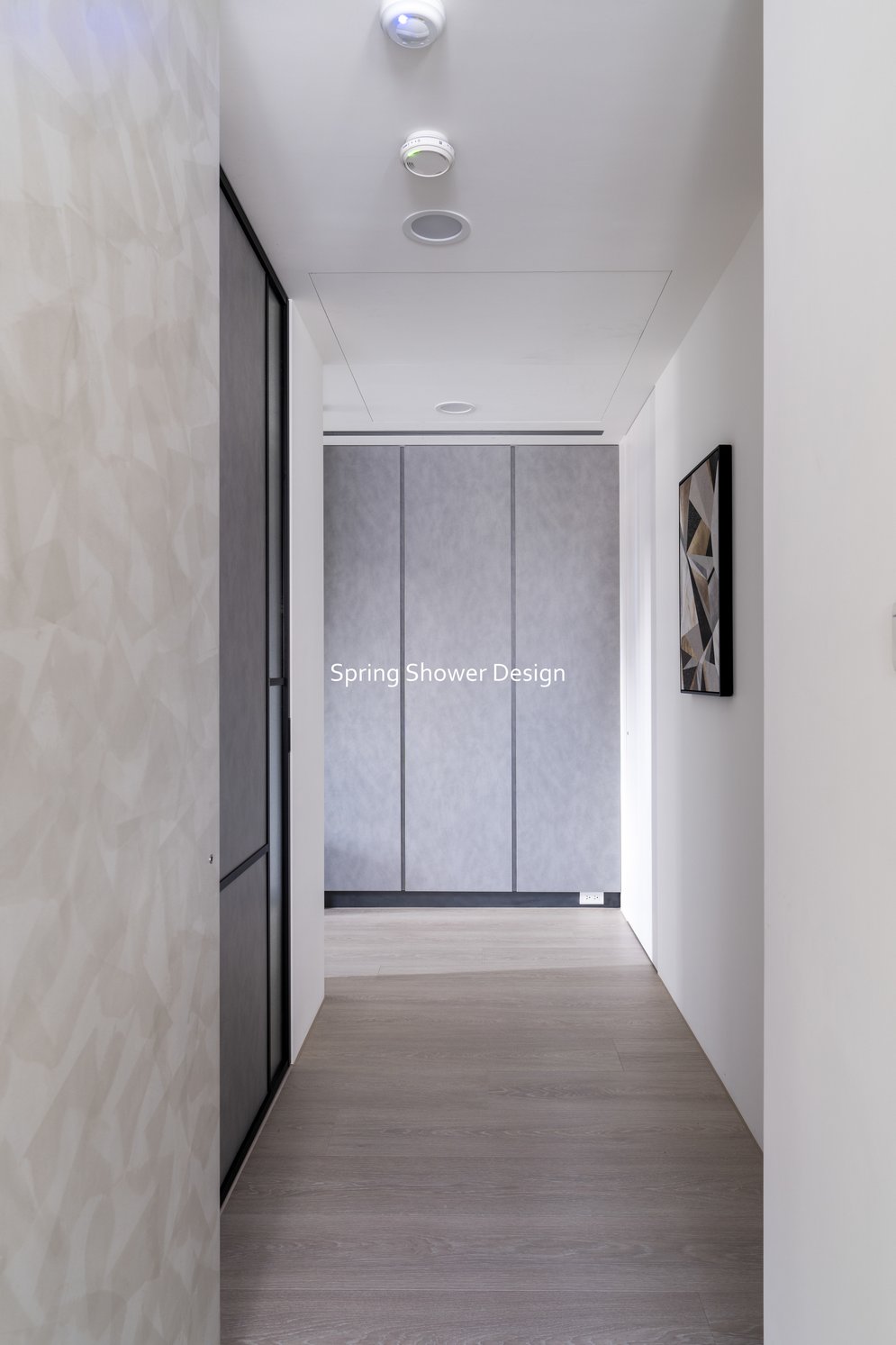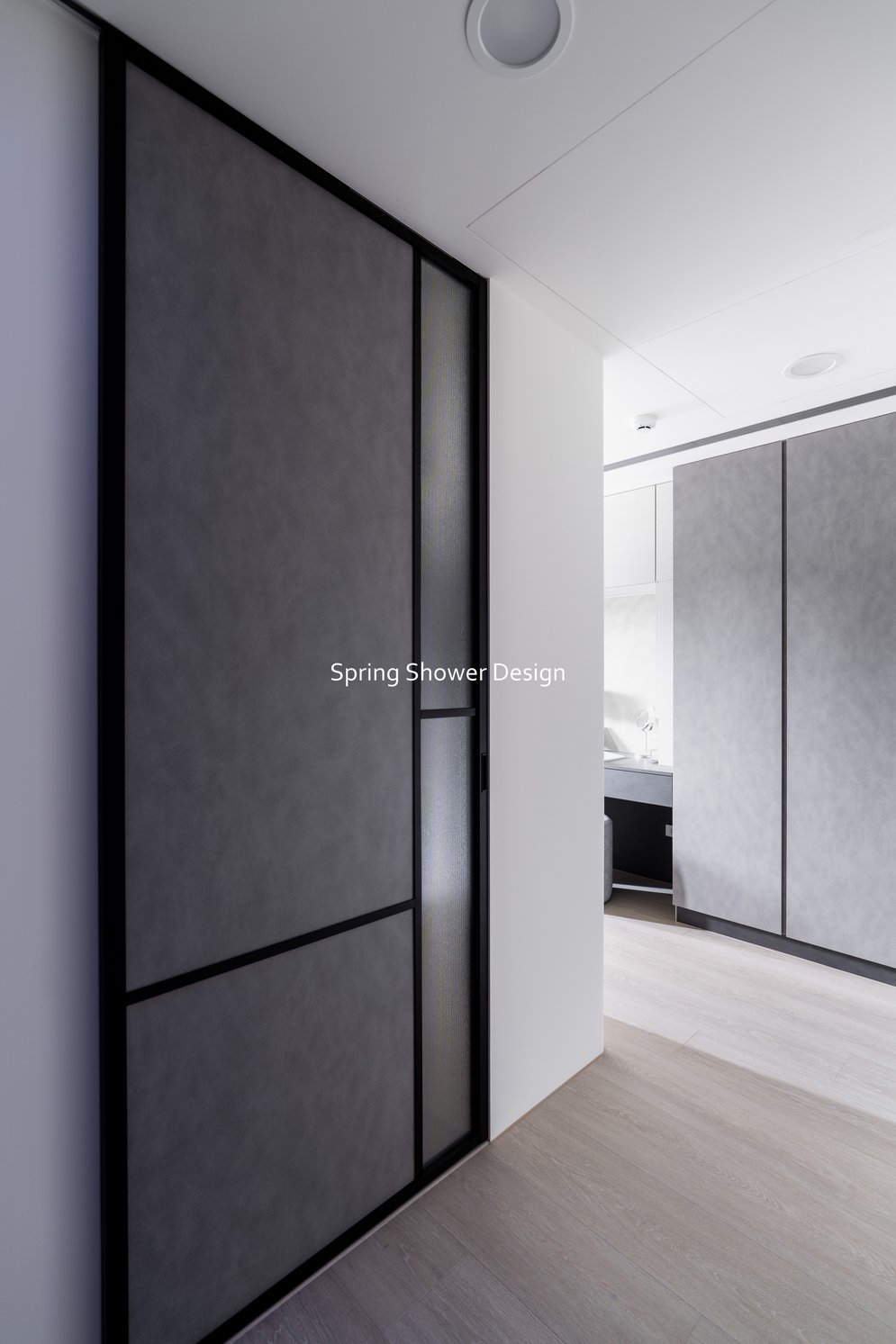 這是一個兩戶合併的家,我們保留三間衛浴與兩個廚房,重新規劃格局與收納,讓公共空間方正明亮,私領域舒適實用。玄關空間巧妙利用原本的長型格局,一分為二:前半部作為衣帽間,與新玄關互通,後半部成為主臥更衣室。隔間採用陶粒牆,增加隔音效果;鞋櫃、穿鞋椅與隱藏鏡面設計,兼顧美觀與使用便利。